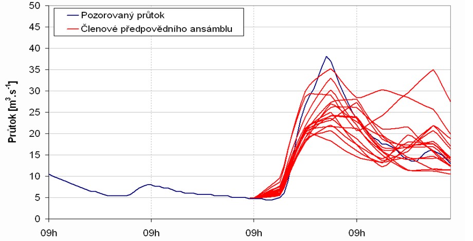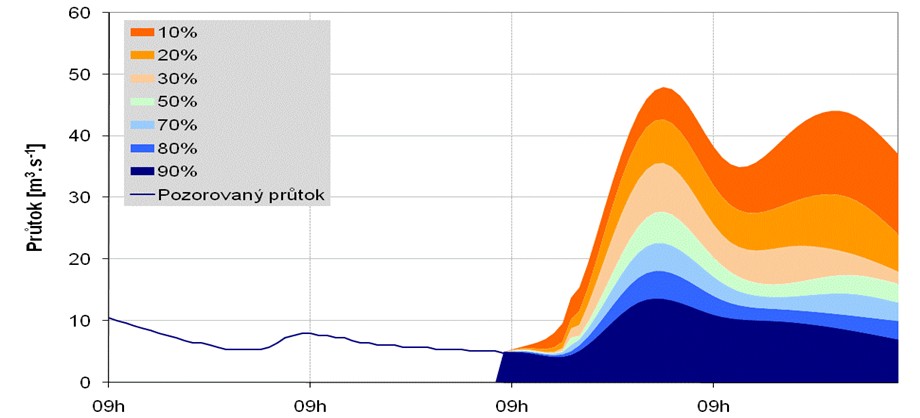 s rozptylem možných variant průběhu průtoku v závislosti na vstupující srážkové předpovědi