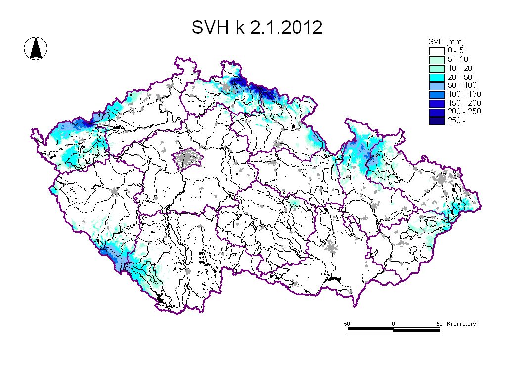 Mapa rozložení vodní hodnoty sněhu (SVH) v ČR ke dni 02.01.2012