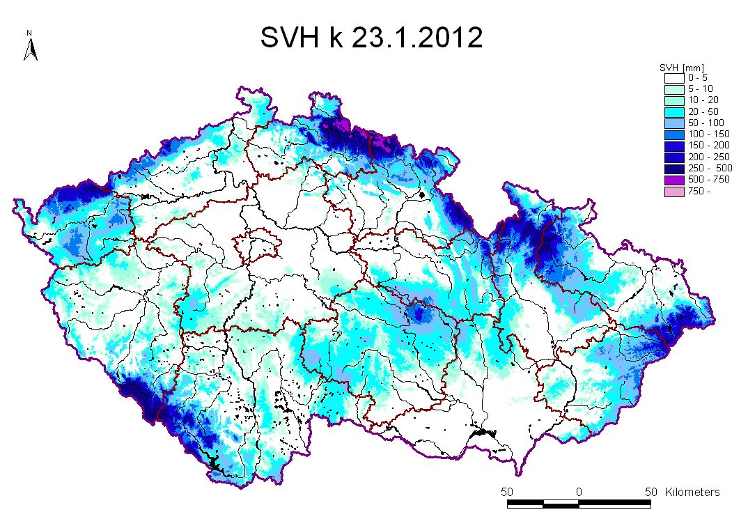 Mapa rozložení vodní hodnoty sněhu (SVH) v ČR ke dni 23.01.2012