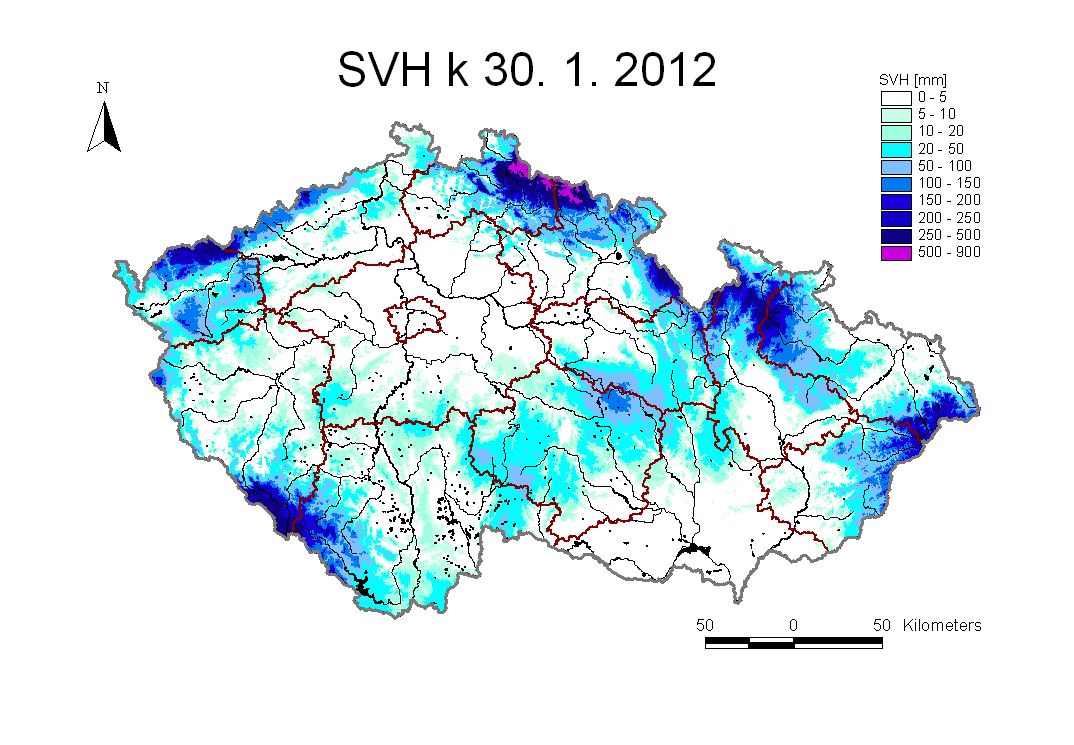 Mapa rozložení vodní hodnoty sněhu (SVH) v ČR ke dni 30.01.2012