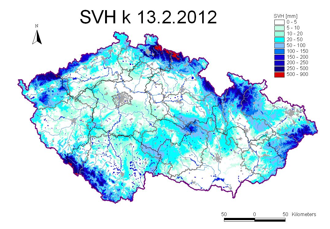 Mapa rozložení vodní hodnoty sněhu (SVH) v ČR ke dni 13.02.2012