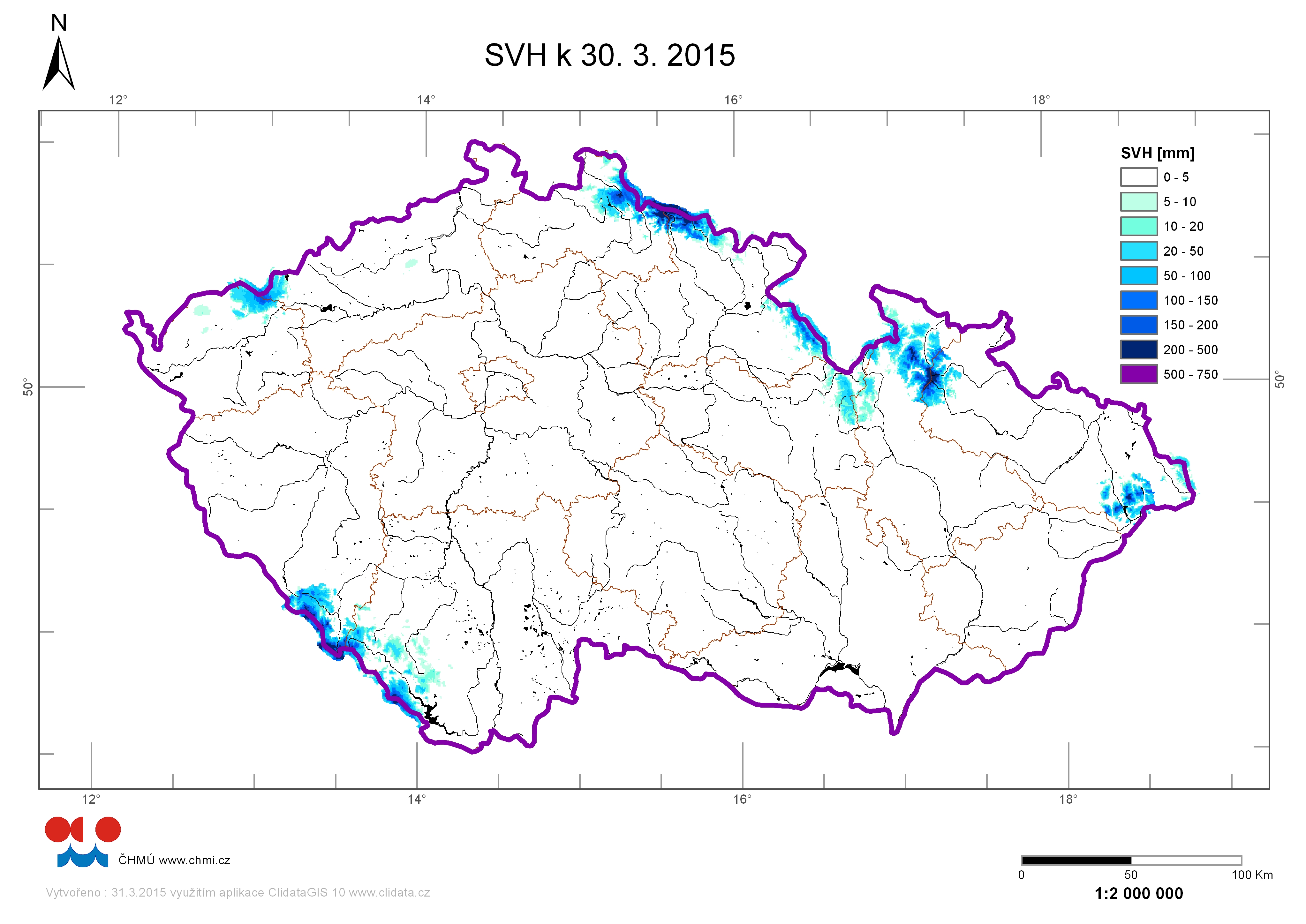 Odhad celkového množství sněhových zásob na území ČR k 30. 3. 2015 se oproti minulému týdnu mírně snížil a činí cca 0,21 miliardy m3, což představuje v průměru cca 2,7 mm (2,7 litry na jeden metr čtvereční).