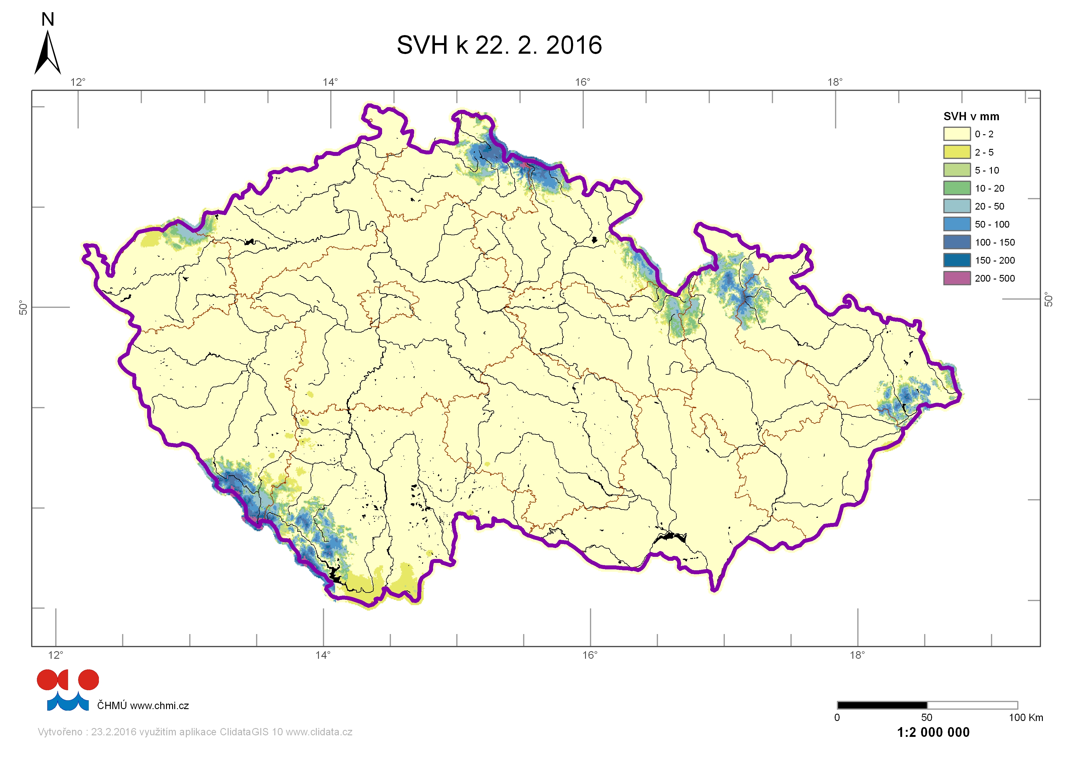 Mapa rozložení vodní hodnoty sněhu (SVH) v ČR ke dni 22.02.2016