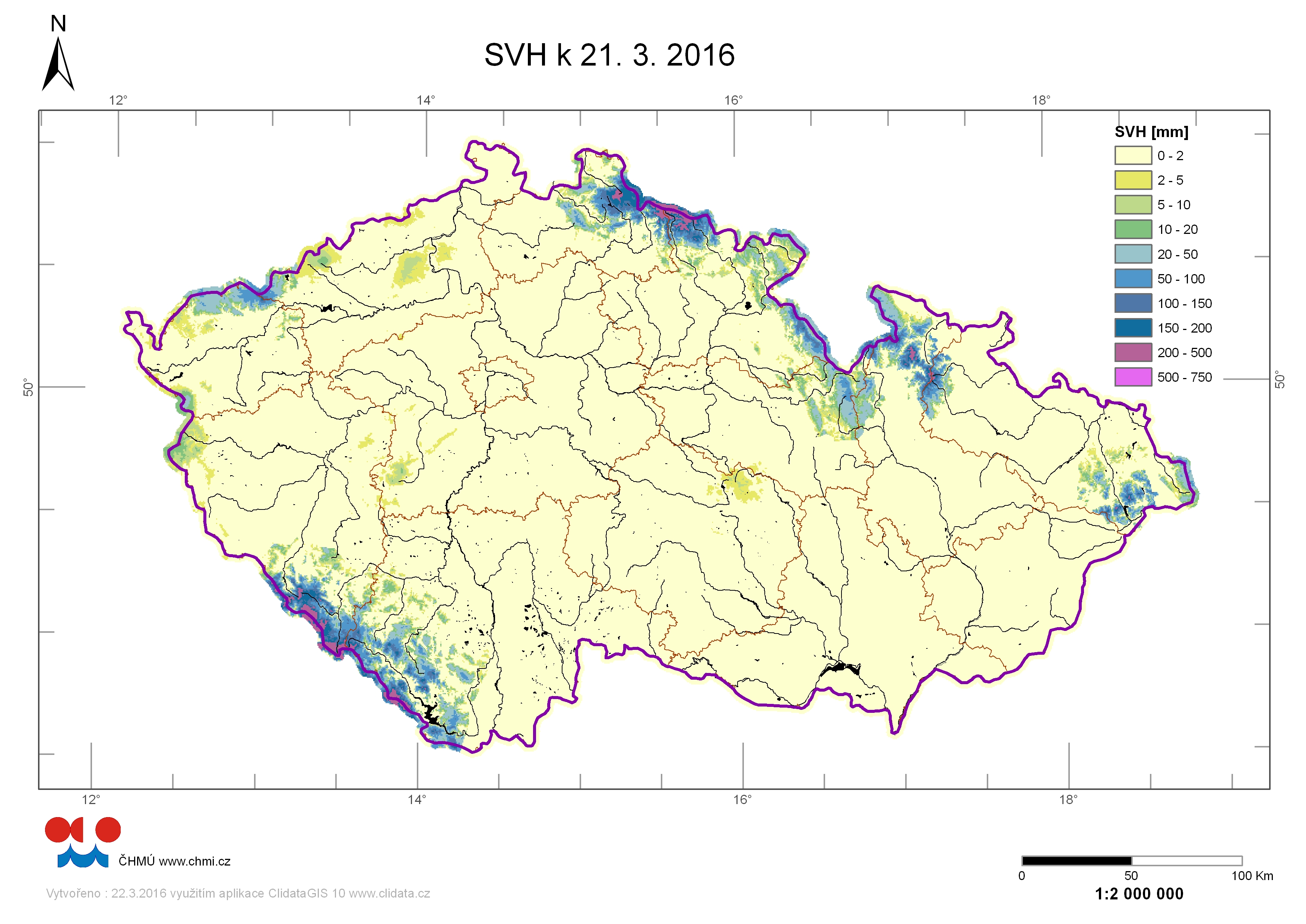 Mapa rozložení vodní hodnoty sněhu (SVH) v ČR ke dni 21.03.2016