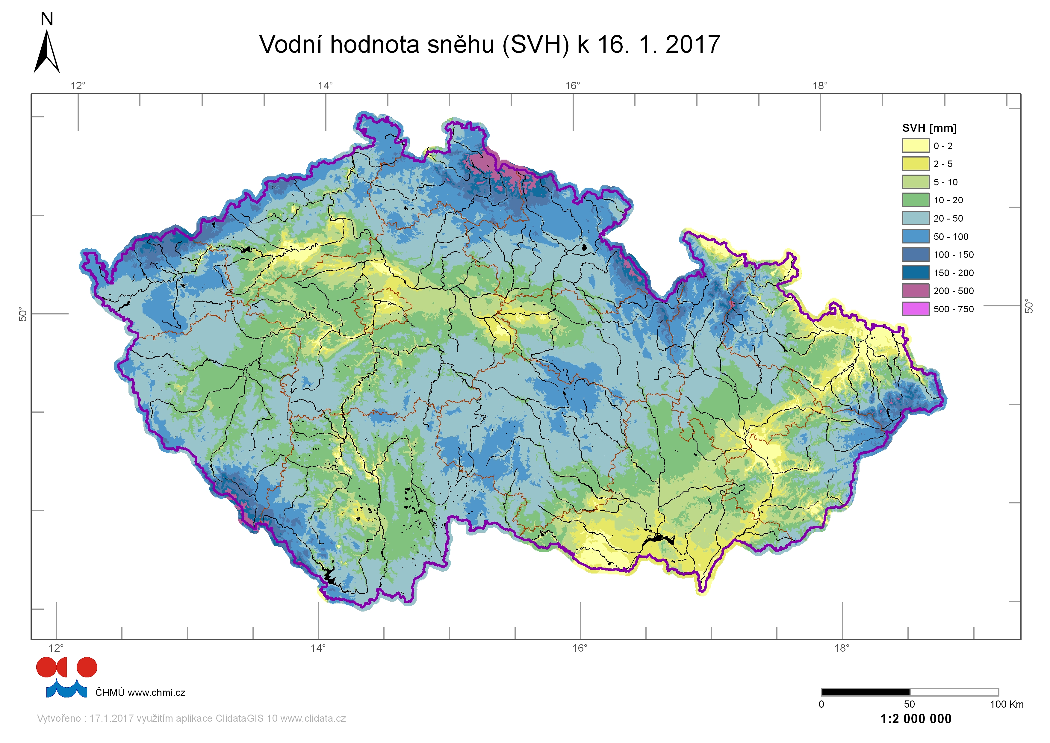 Odhad celkového množství sněhových zásob na území ČR k 16. 1. 2017 činí cca 2,63 miliardy m3, což představuje v průměru cca 33,4 mm (33,4 litru na jeden metr čtvereční).