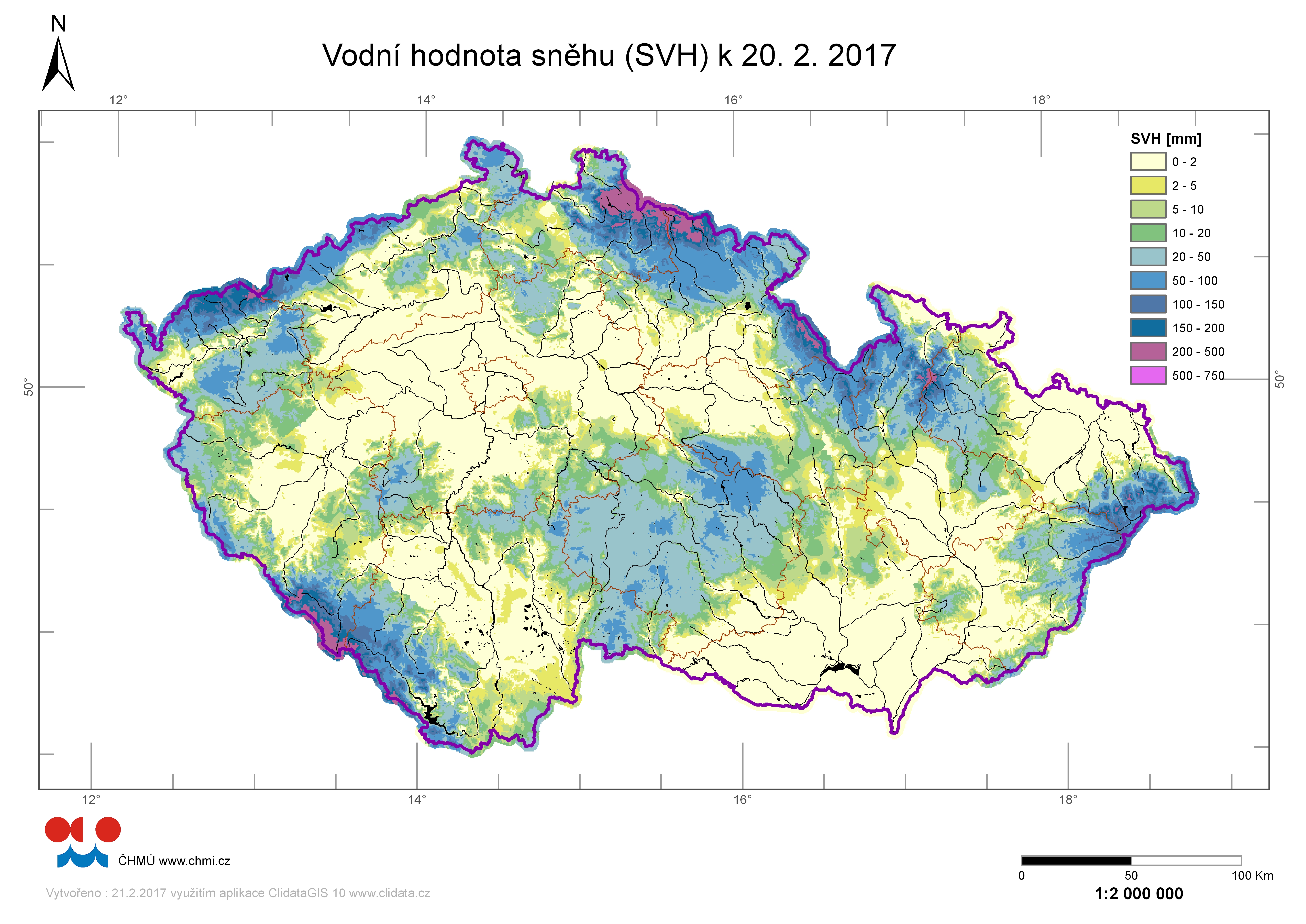 Mapa rozložení vodní hodnoty sněhu (SVH) v ČR ke dni 20.02.2017