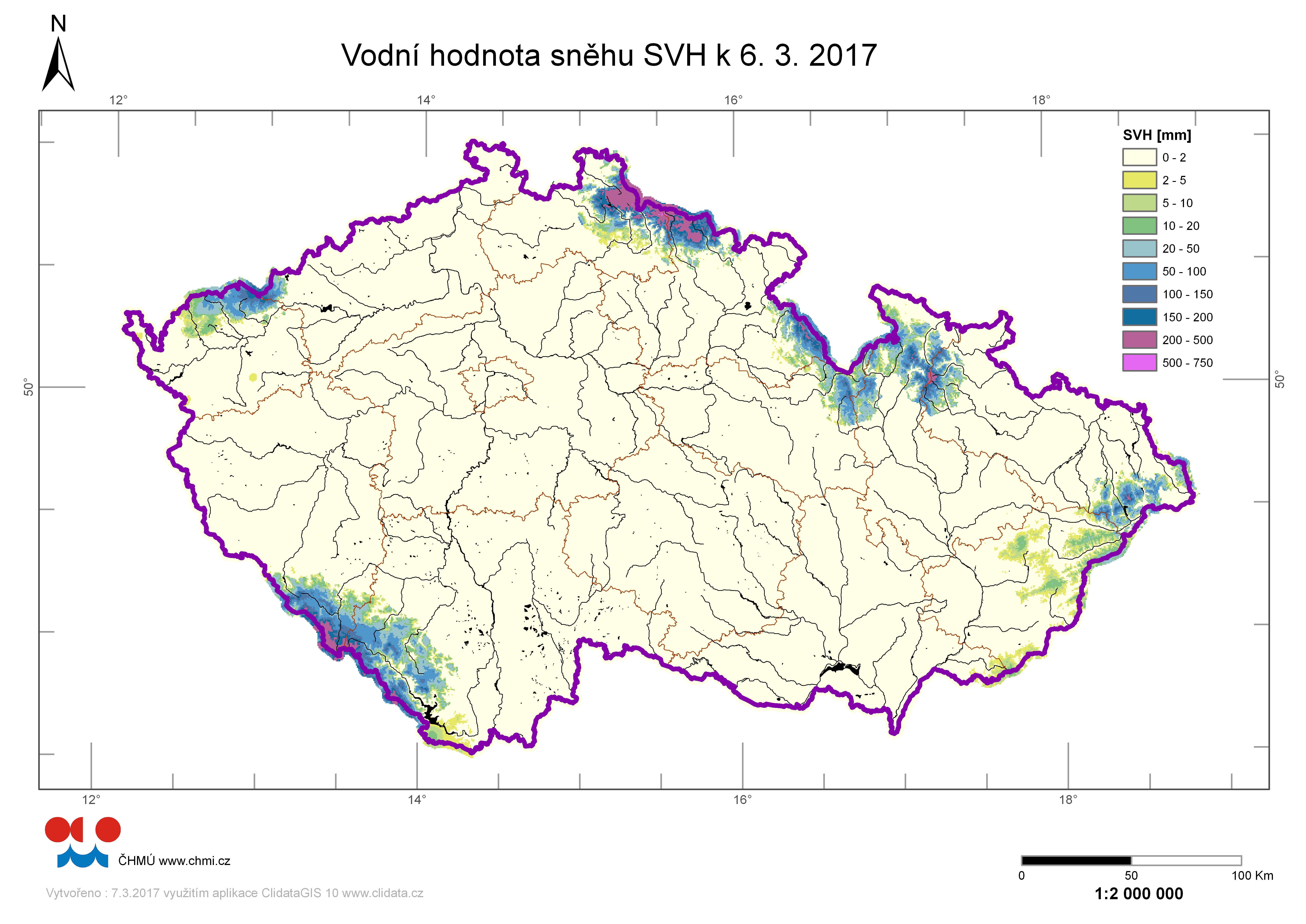 Odhad celkového množství vody ve sněhové pokrývce na území ČR k 6. 3. 2017 činí cca 0,43 miliardy m3, což představuje v průměru cca 5,5 mm (5,5 litru na jeden metr čtvereční).