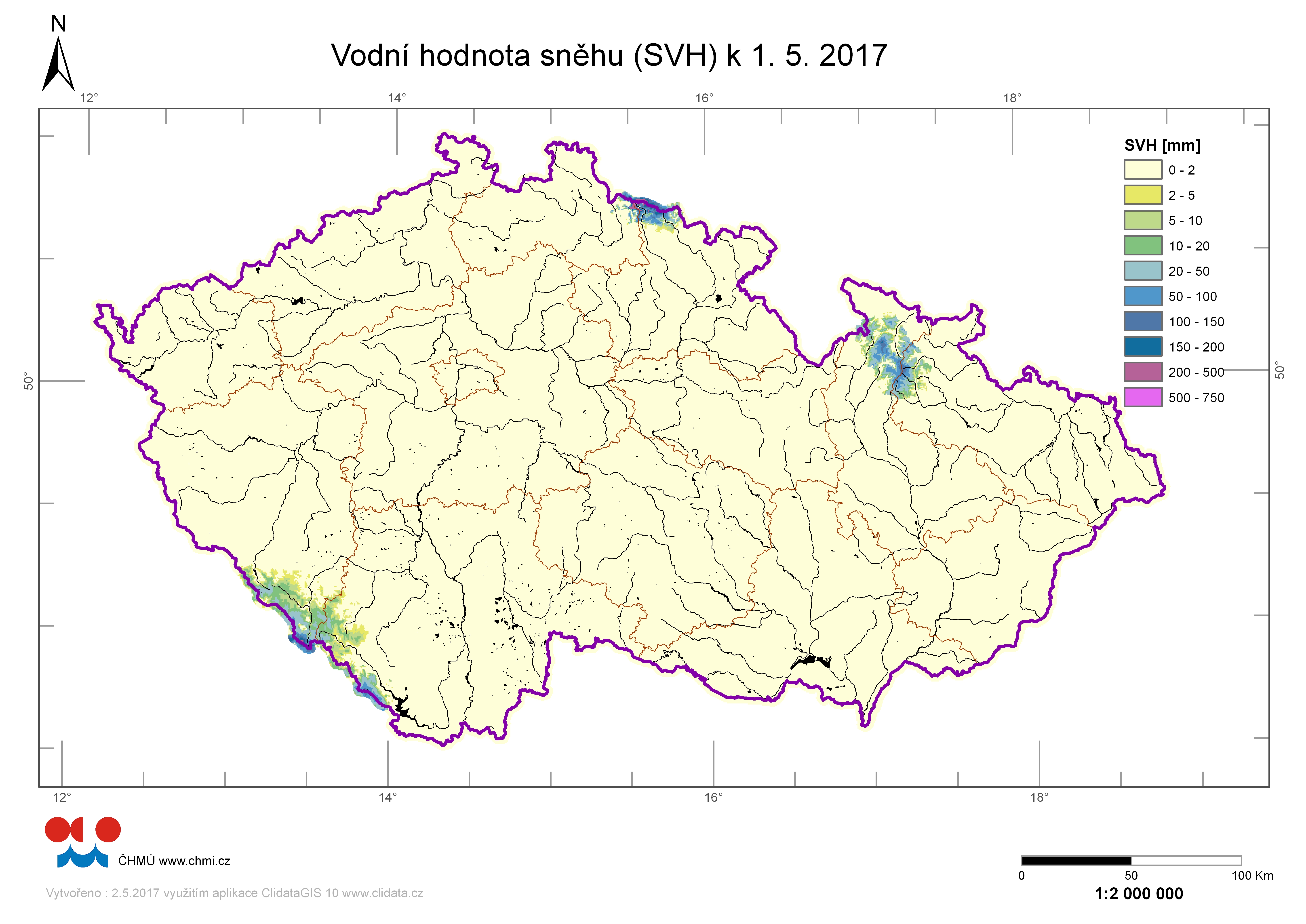 Odhad celkového množství vody ve sněhové pokrývce na území ČR k 1. 5. 2017 činí cca 0,055 miliardy m3, což představuje v průměru cca 0,7 mm (0,7 litru na jeden metr čtvereční).