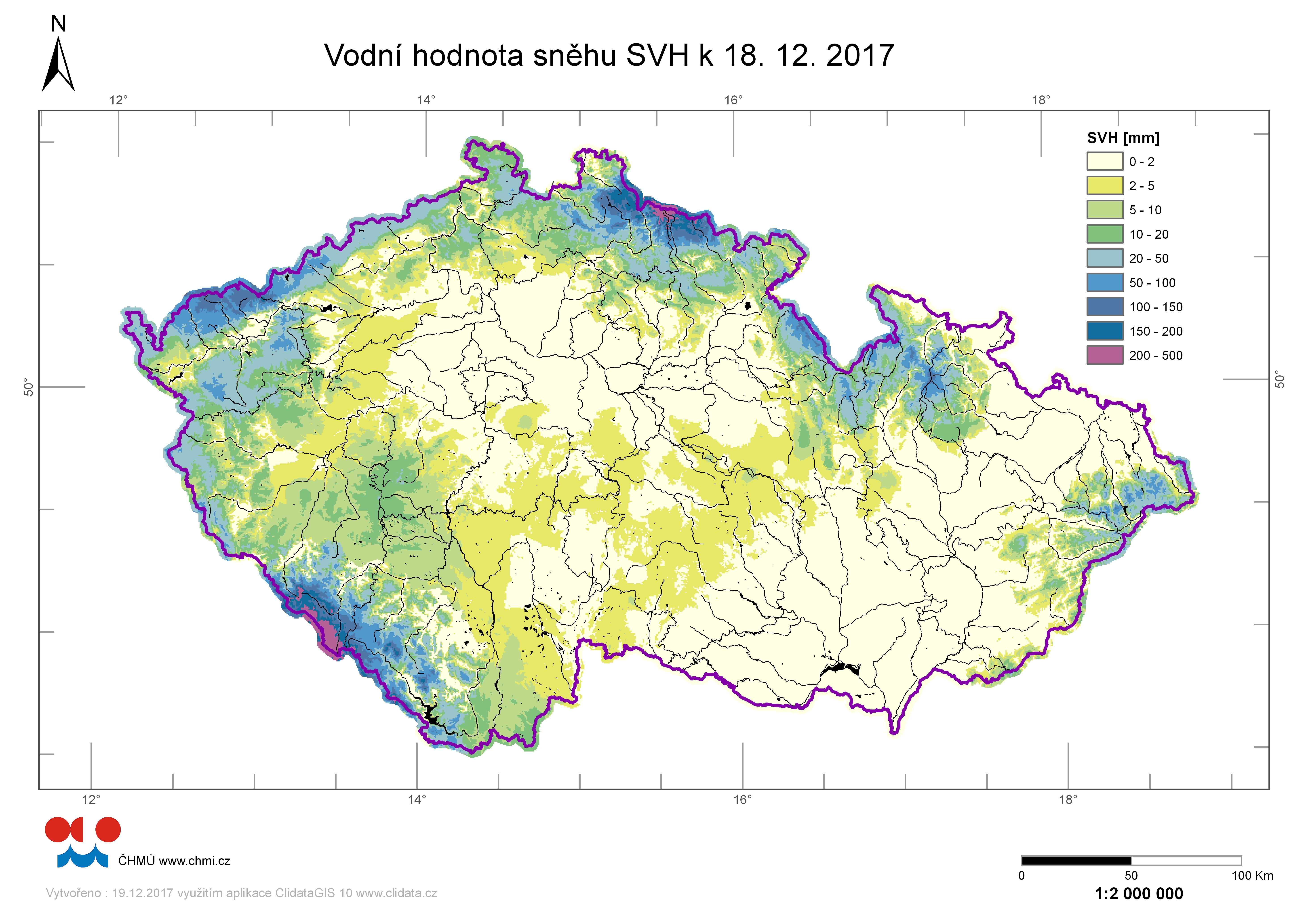 Mapa rozložení vodní hodnoty sněhu (SVH) v ČR ke dni 18.12.2017