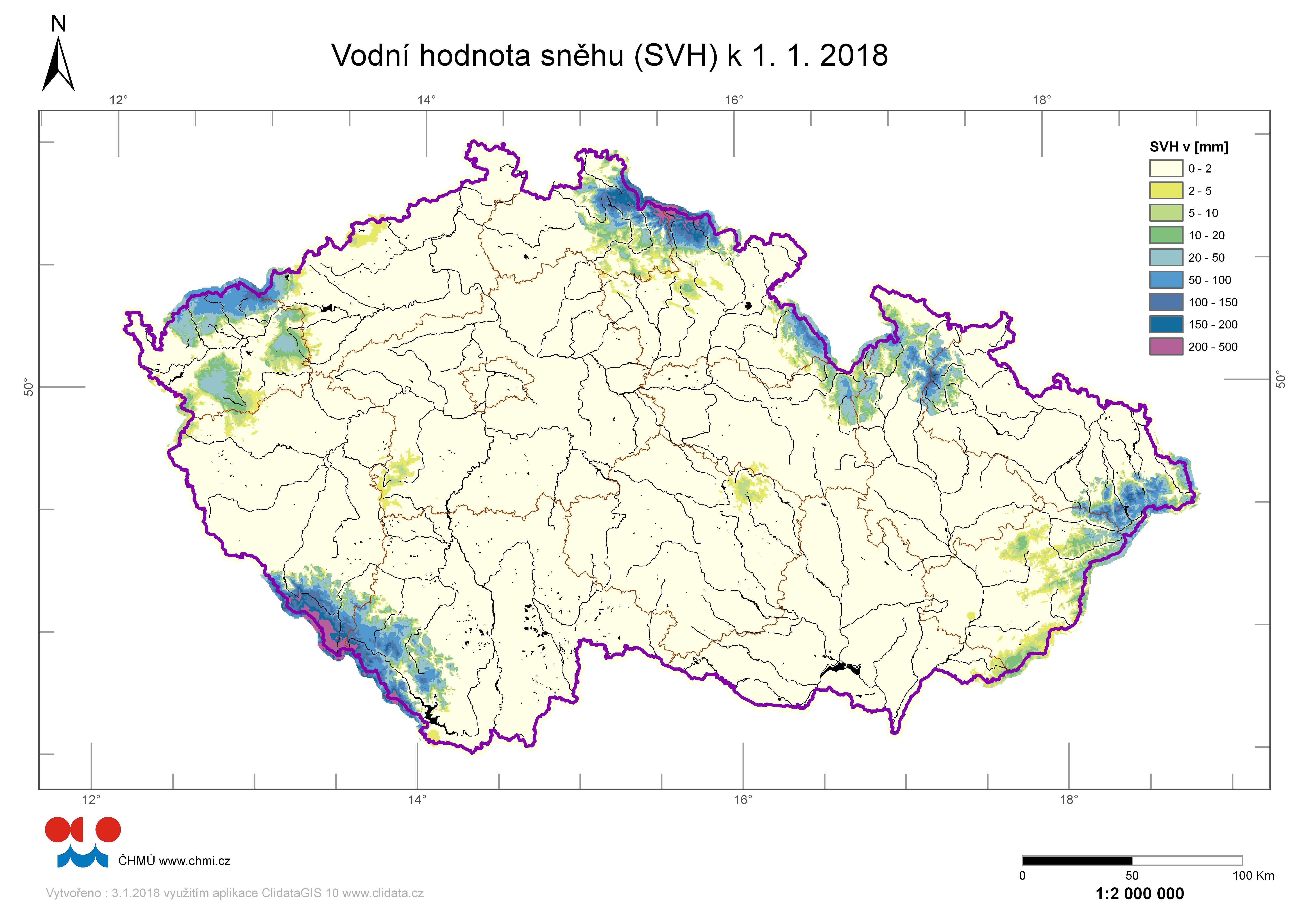 Odhad celkového množství vody ve sněhové pokrývce na území ČR k 1. 1. 2018 činí cca 0,420 miliardy m3, což představuje v průměru cca 5,3 mm (5,3 litru na jeden metr čtvereční).