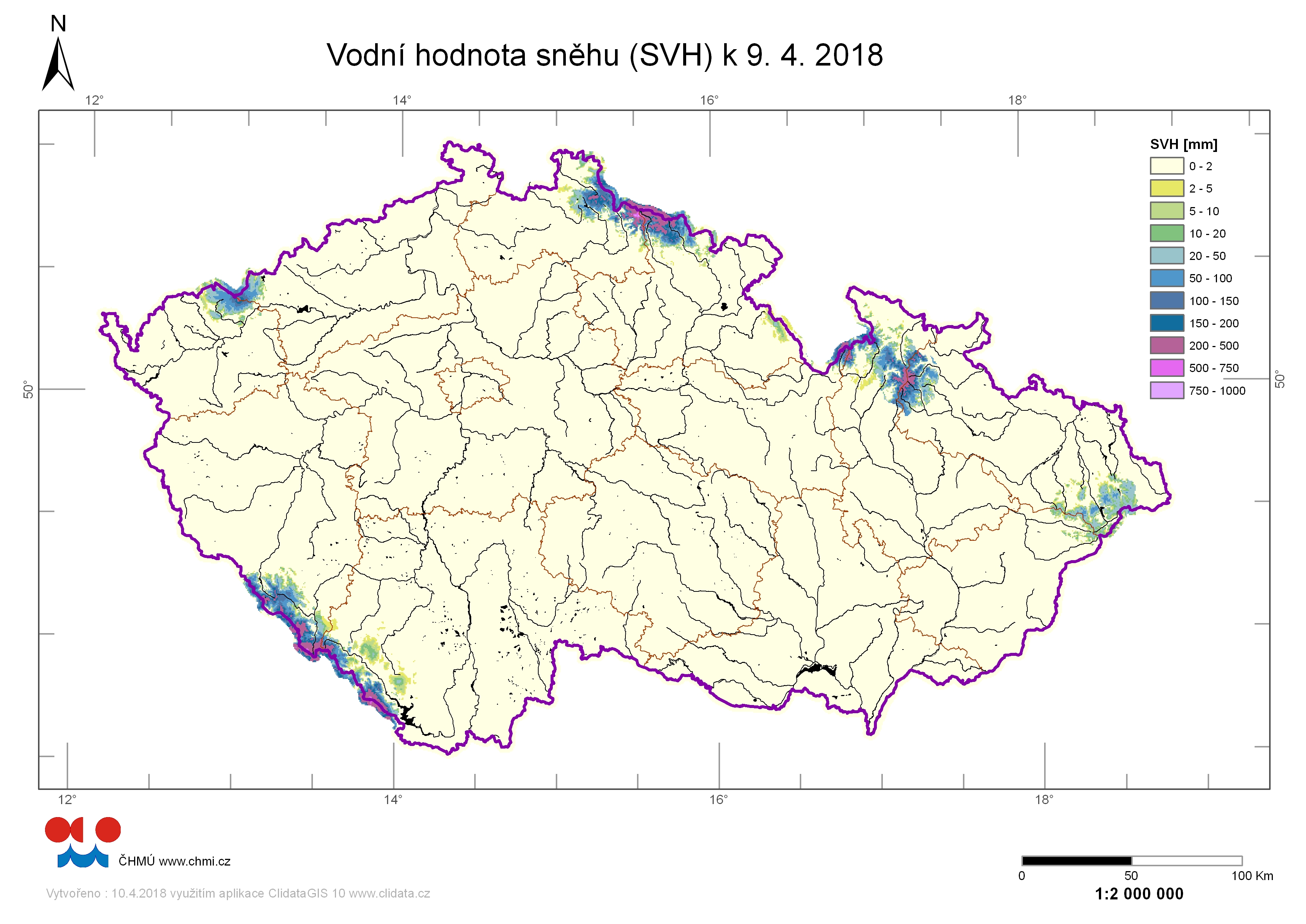 Odhad celkového množství vody ve sněhové pokrývce na území ČR k 9. 4. 2018 činí cca 0,260 mld. m3, což představuje v průměru cca 3,3 mm (3,3 litrů na jeden metr čtvereční).