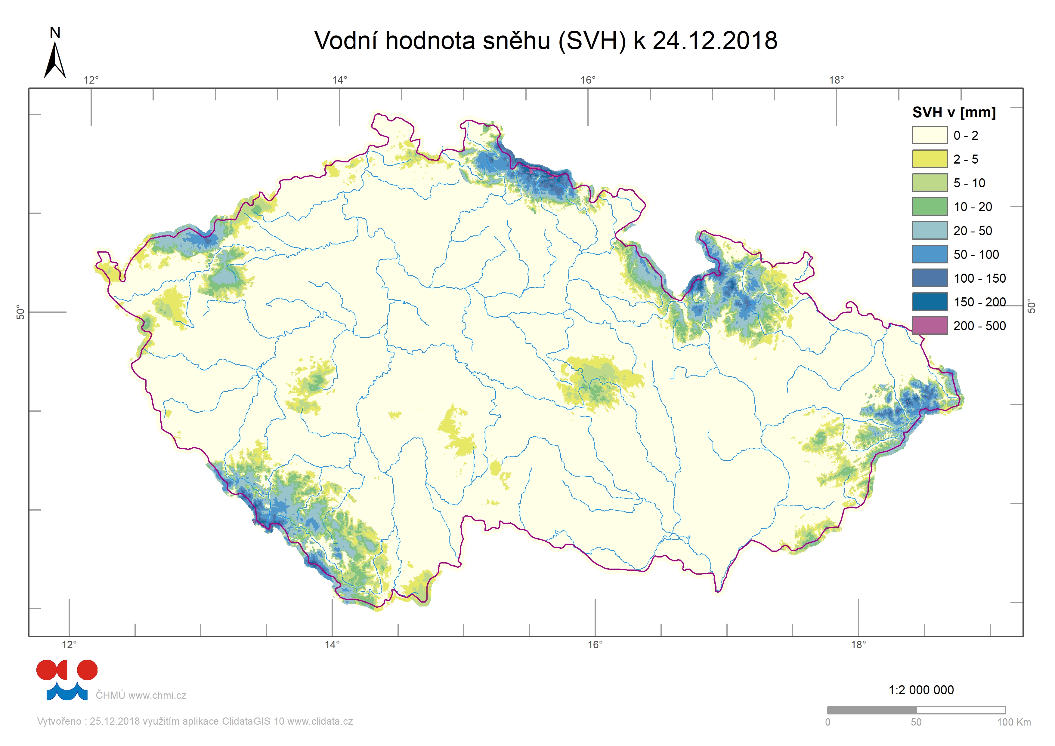 Odhad celkového množství vody ve sněhové pokrývce na území ČR k 24 12. 2018 činí cca 0,315 mld. m3, což představuje v průměru cca 4 mm (4 litru na jeden metr čtvereční).