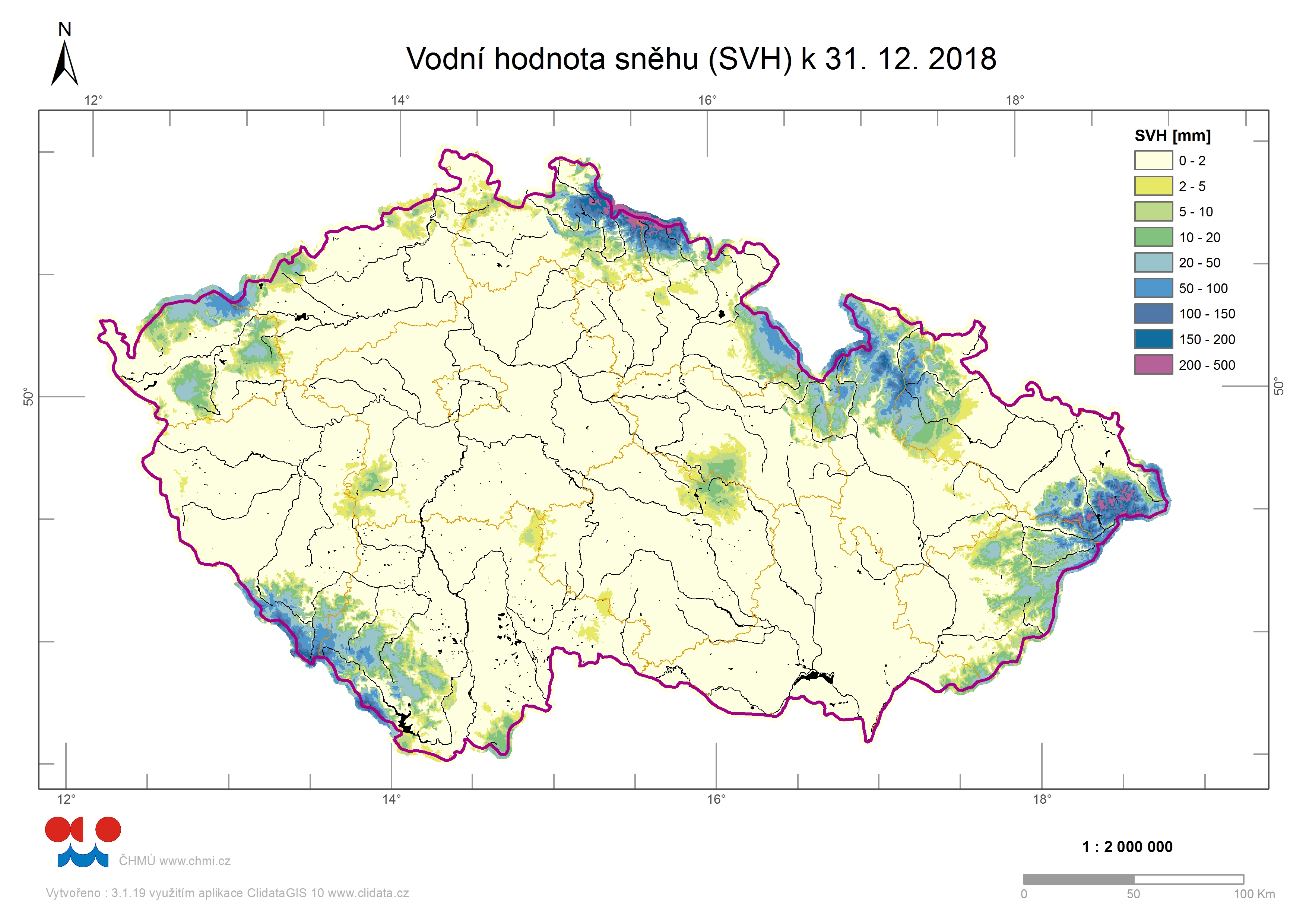 Odhad celkového množství vody ve sněhové pokrývce na území ČR k 31. 12. 2018 činí cca 0,473mld. m3, což představuje v průměru cca 6 mm (6 litrů na jeden metr čtvereční).