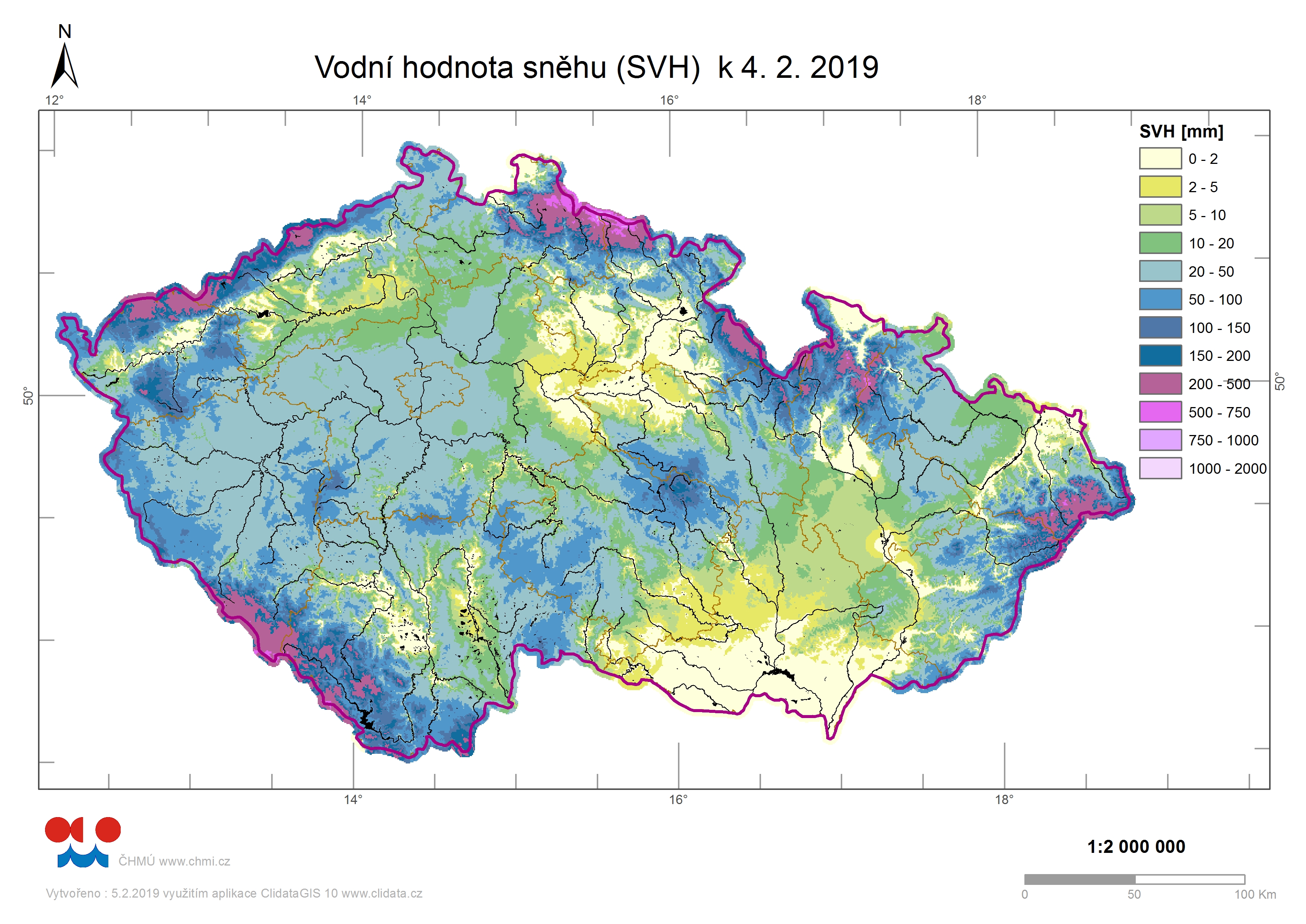 Odhad celkového množství vody ve sněhové pokrývce na území ČR k 4 2. 2019 činí cca 3,5 mld. m3, což představuje v průměru cca 44,4 mm (44,4 litrů na jeden metr čtvereční).