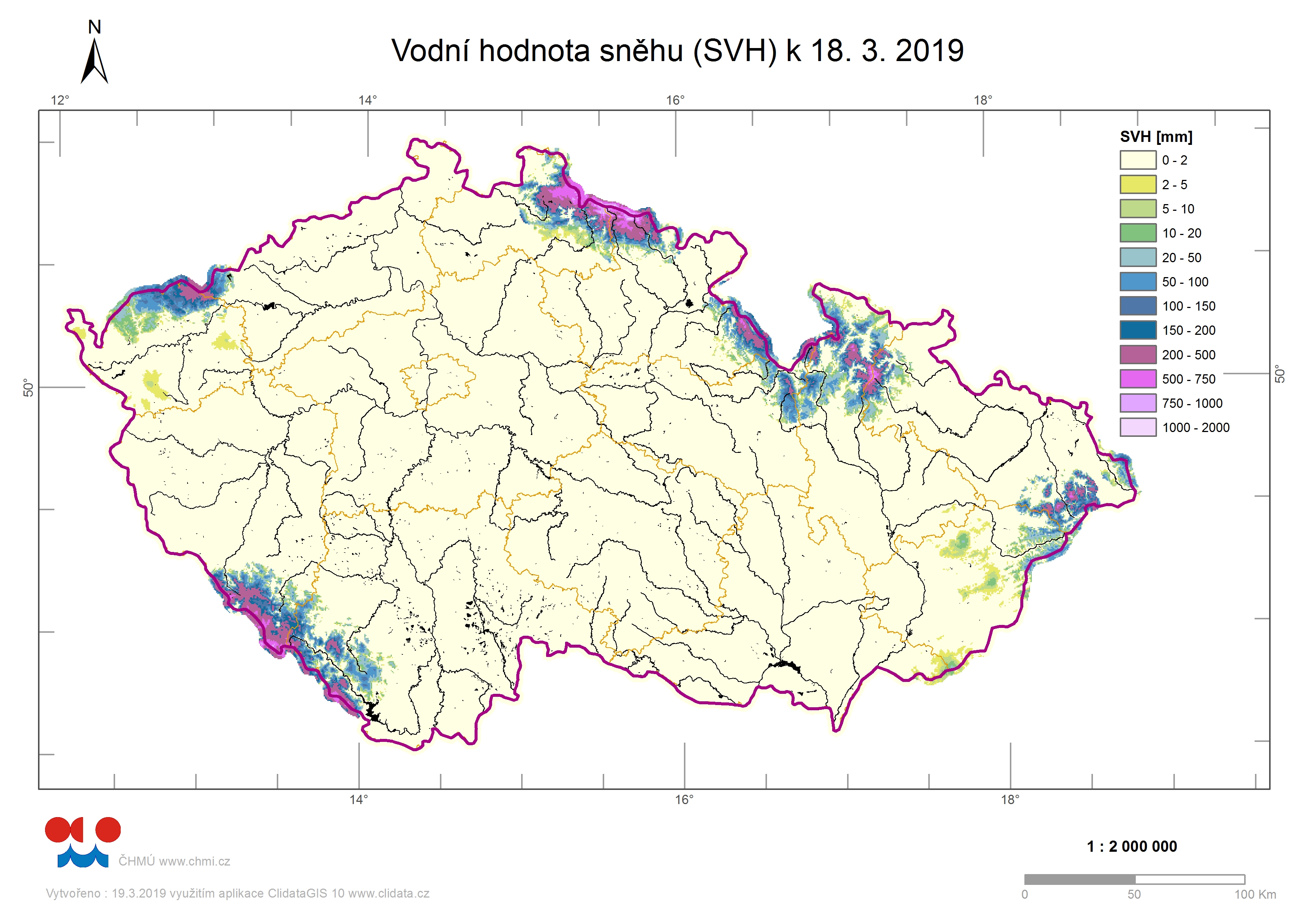 Odhad celkového množství vody ve sněhové pokrývce na území ČR k 18. 3. 2019 činí cca 0,828 mld. m3, což představuje v průměru cca 10,5 mm (10,5 litrů na jeden metr čtvereční).