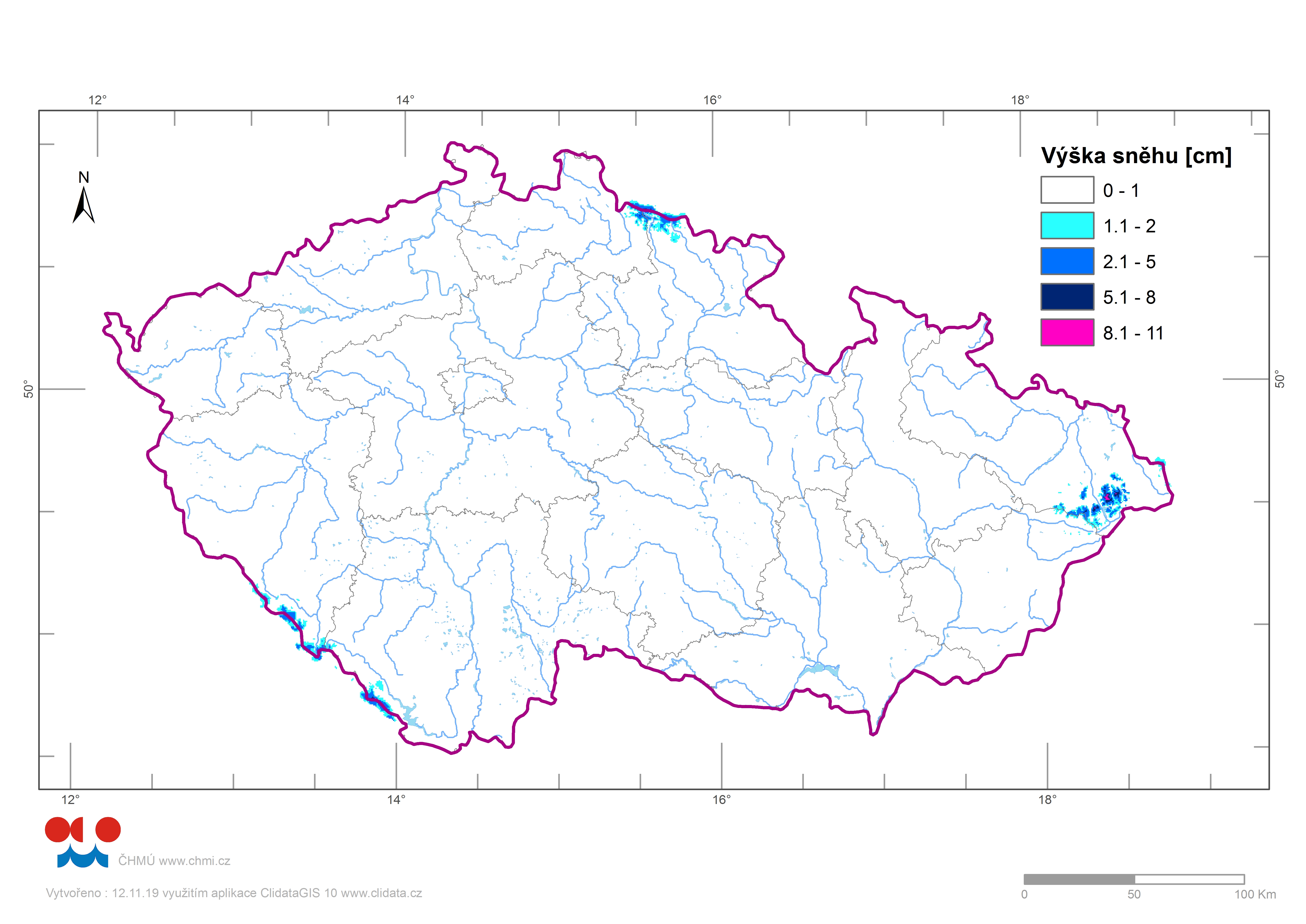 Během soboty 9. 11. slabě sněžilo v nejvyšších partiích Krkonoš a Šumavy a v neděli 10. 11. v oblasti Moravskoslezských Beskyd. K pondělnímu ránu byla naměřena nejvyšší sněhová pokrývka 10 cm na Lysé hoře v Beskydech (15 mm vodní hodnoty). Na Šumavě bylo naměřeno na Plechém a Březníku-hřebeni 6 cm, v Krkonoších na Labské boudě 5 cm a na Luční boudě 4 cm výšky sněhu.