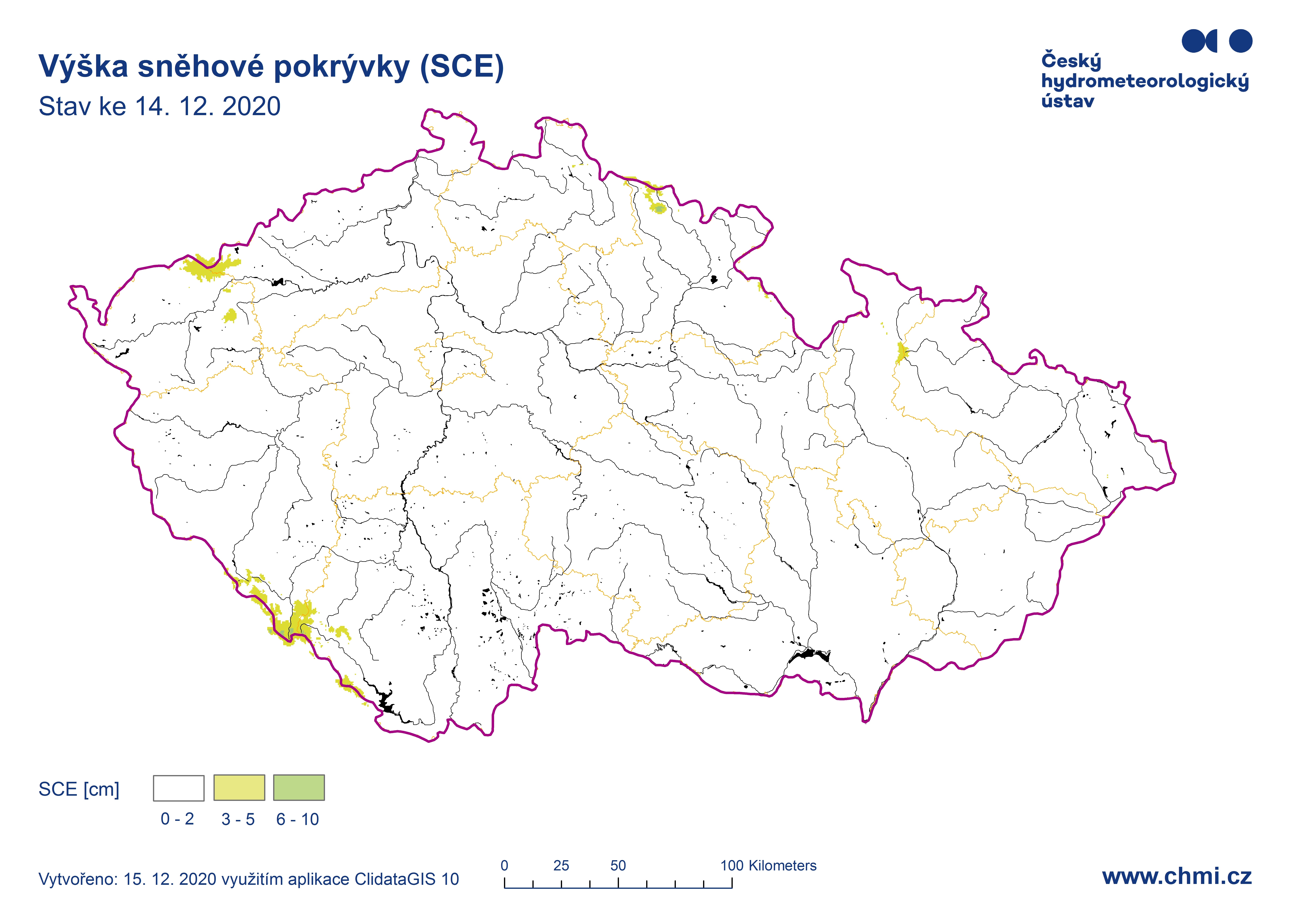 Měřitelná sněhová pokrývka byla k pondělnímu ránu 14. 12. pouze na hřebenech Šumavy, Krušných hor, Jizerských hor, Krkonoš, Hrubého Jeseníku a Moravskoslezských Beskyd (1-8 cm).