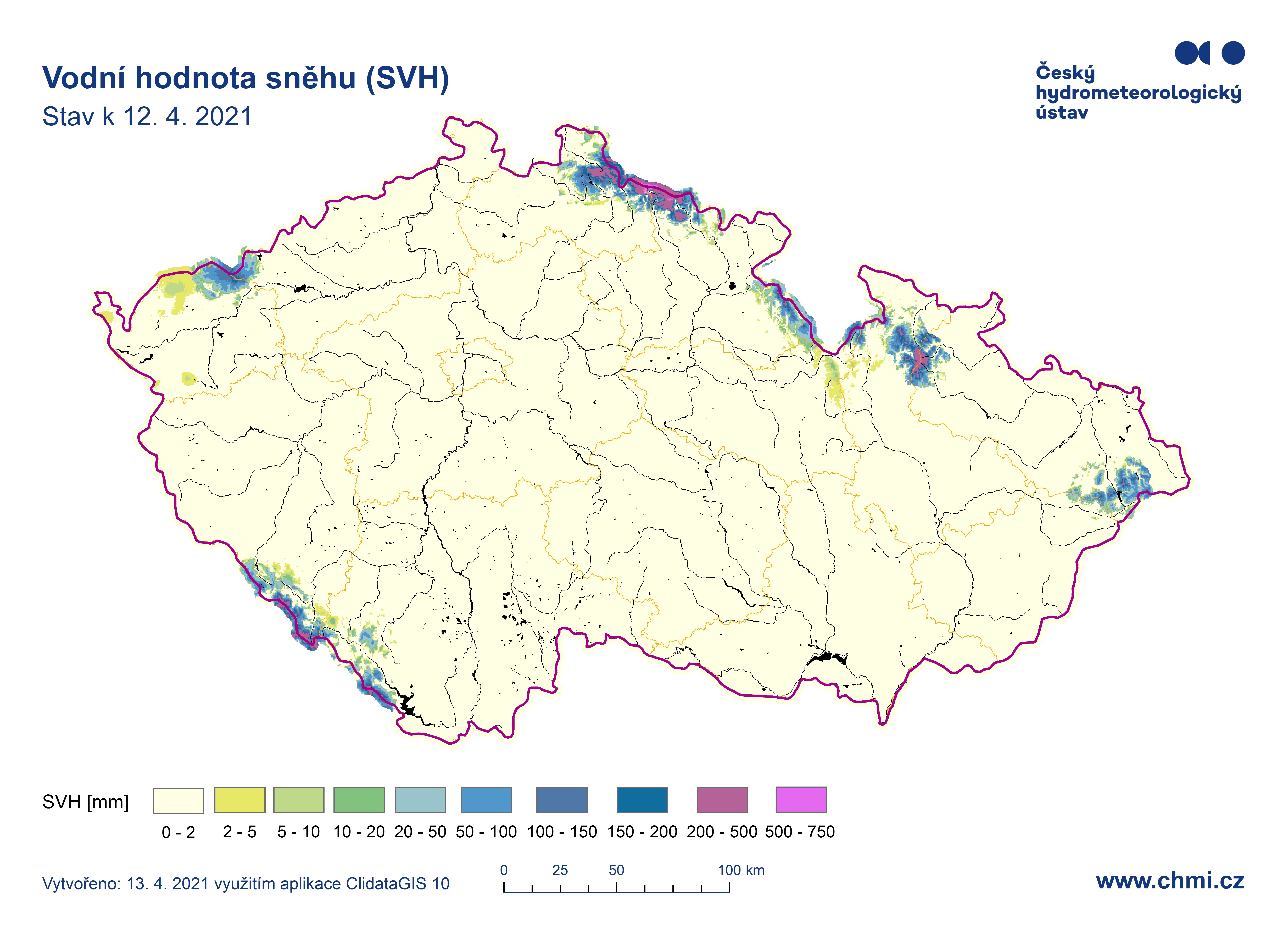 Odhad celkového množství vody ve sněhové pokrývce na území ČR ke 12. 4. 2021 činí cca 0,237 mld. m3, což představuje v průměru cca 3 mm (3 litry na jeden metr čtvereční).