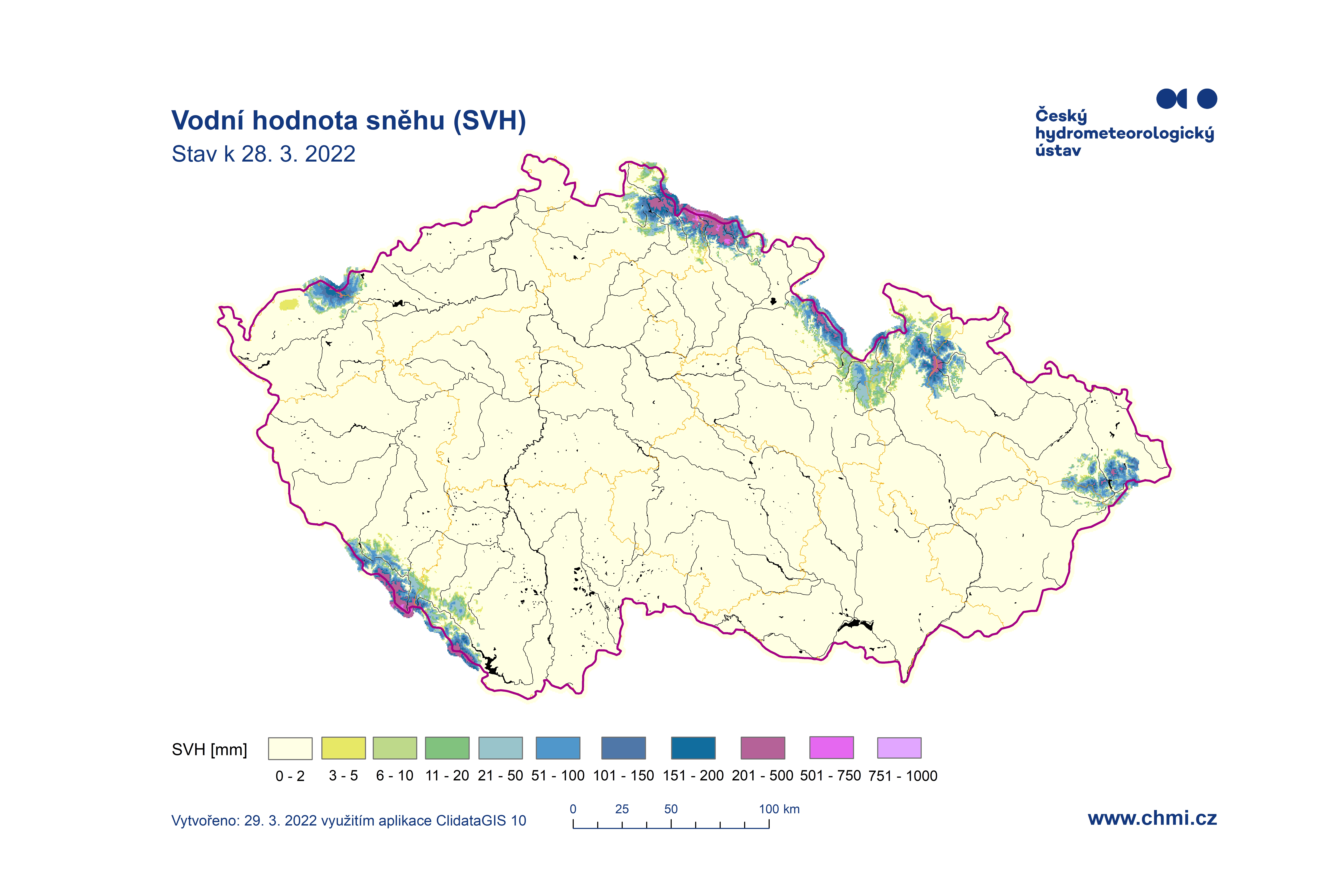 Odhad celkového množství vody ve sněhové pokrývce na území ČR k 28. 3. 2022 činí cca 0,355 mld. m3, což představuje v průměru cca 4,5 mm (4,5 litru na jeden metr čtvereční).