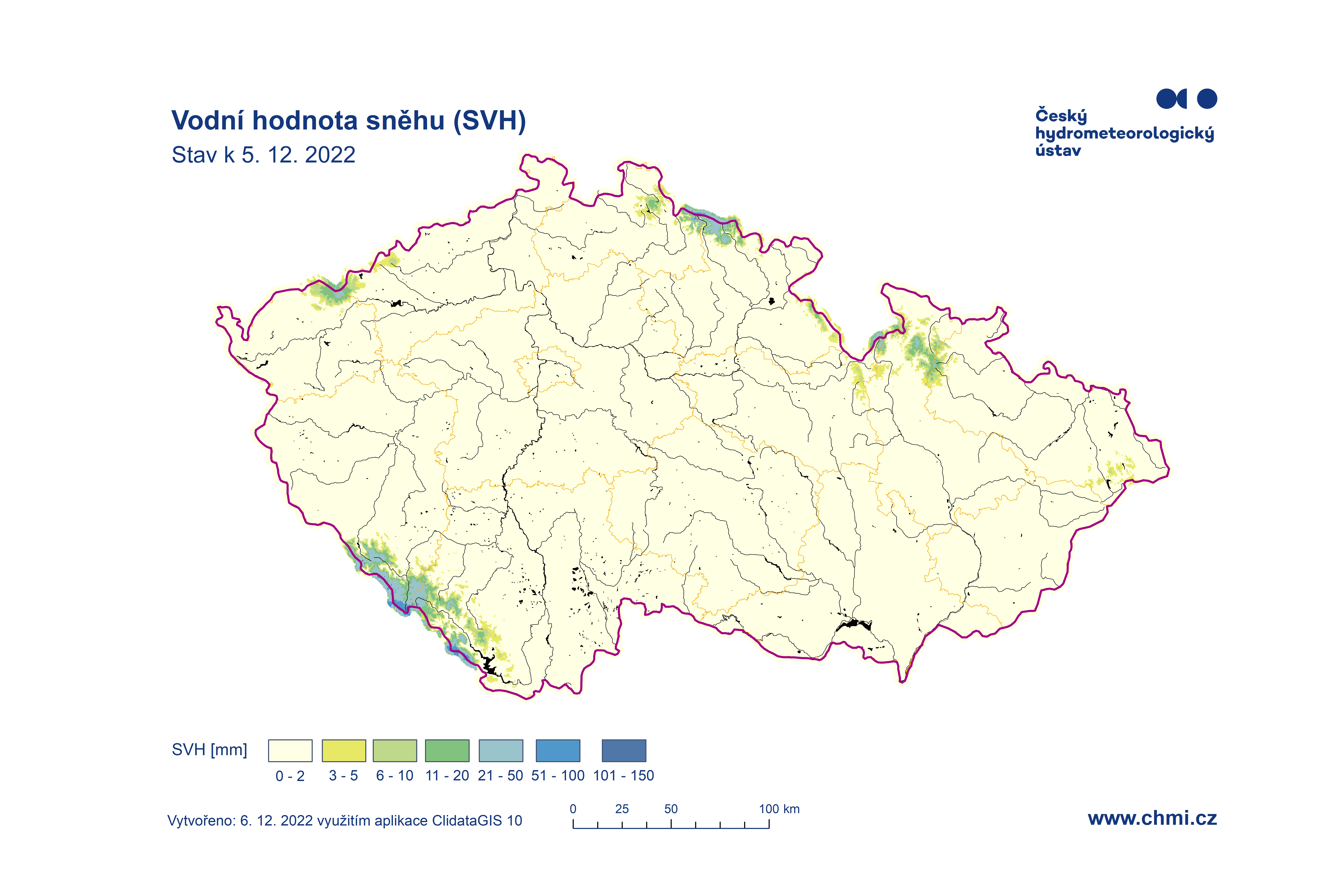 Odhad celkového množství vody ve sněhové pokrývce na území ČR k 5. 12. 2022 činí cca 0,039 mld. m3, což představuje v průměru cca 0,5 mm (0,5 litru na jeden metr čtvereční).
