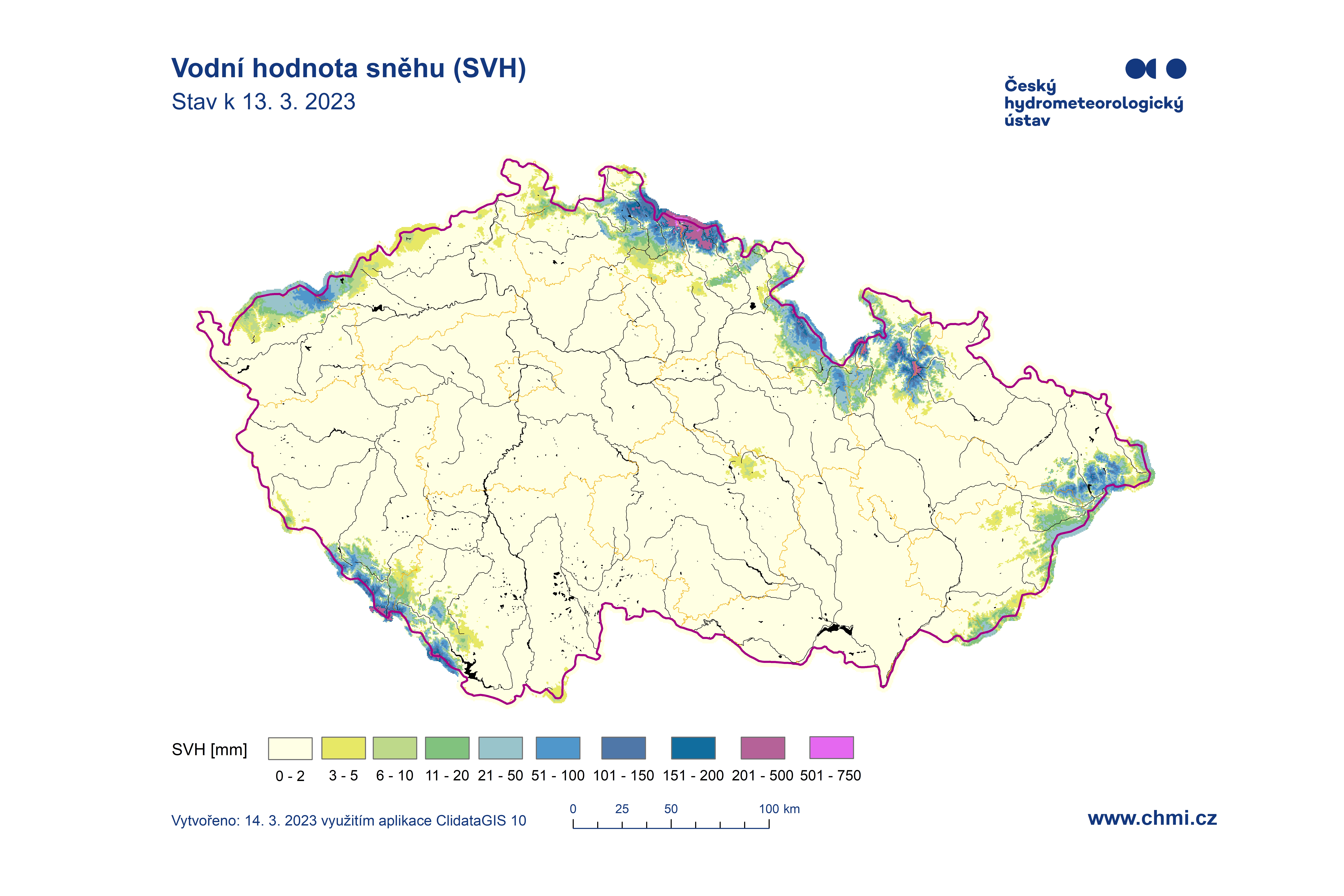 Odhad celkového množství vody ve sněhové pokrývce na území ČR k 13. 3. 2023 činí cca 0,339 mld. m3, což představuje v průměru cca 4,3 mm (4,3 litrů na jeden metr čtvereční).