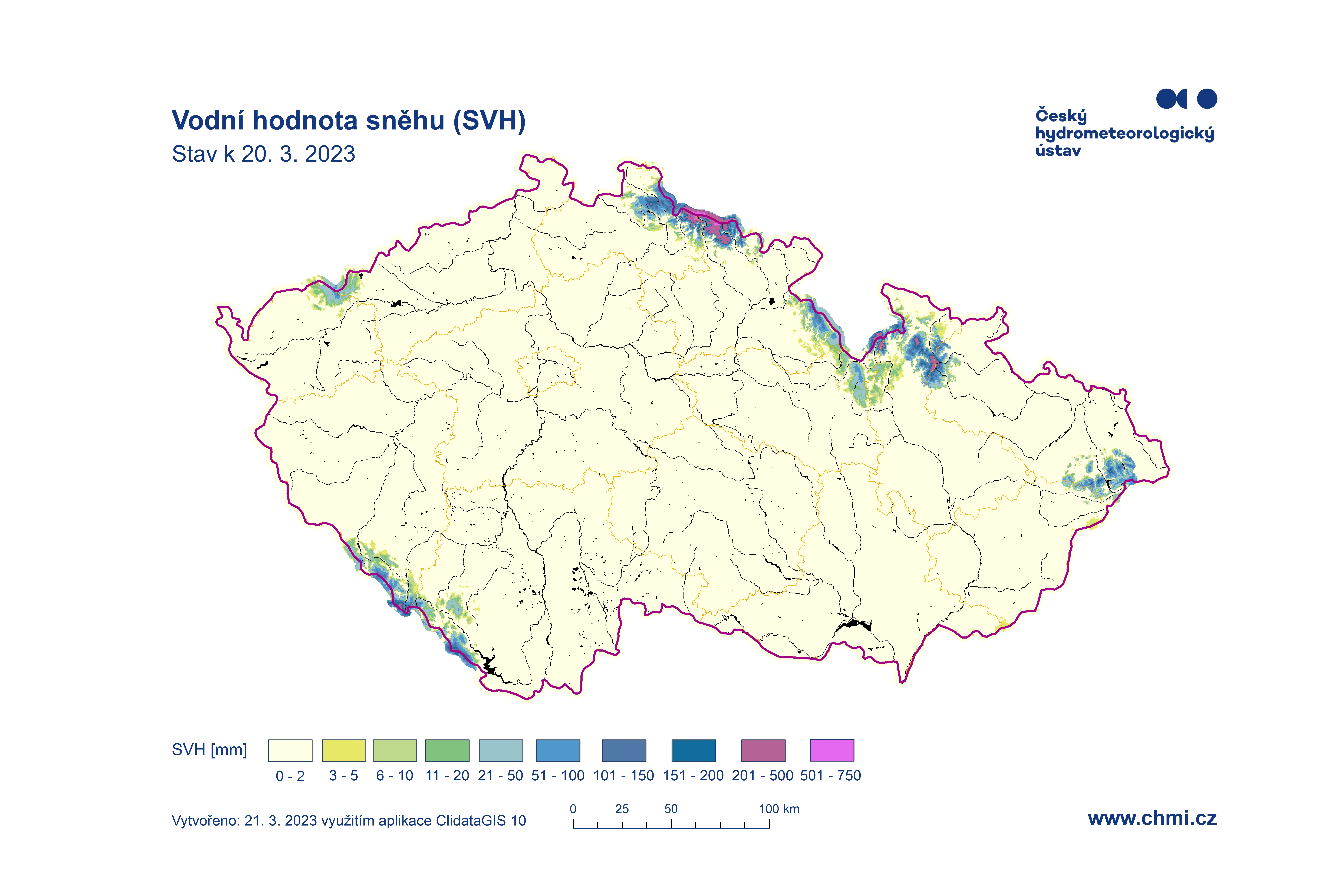 Odhad celkového množství vody ve sněhové pokrývce na území ČR k 20. 3. 2023 činí cca 0,197 mld. m3, což představuje v průměru cca 2,5 mm (2,5 litrů na jeden metr čtvereční).