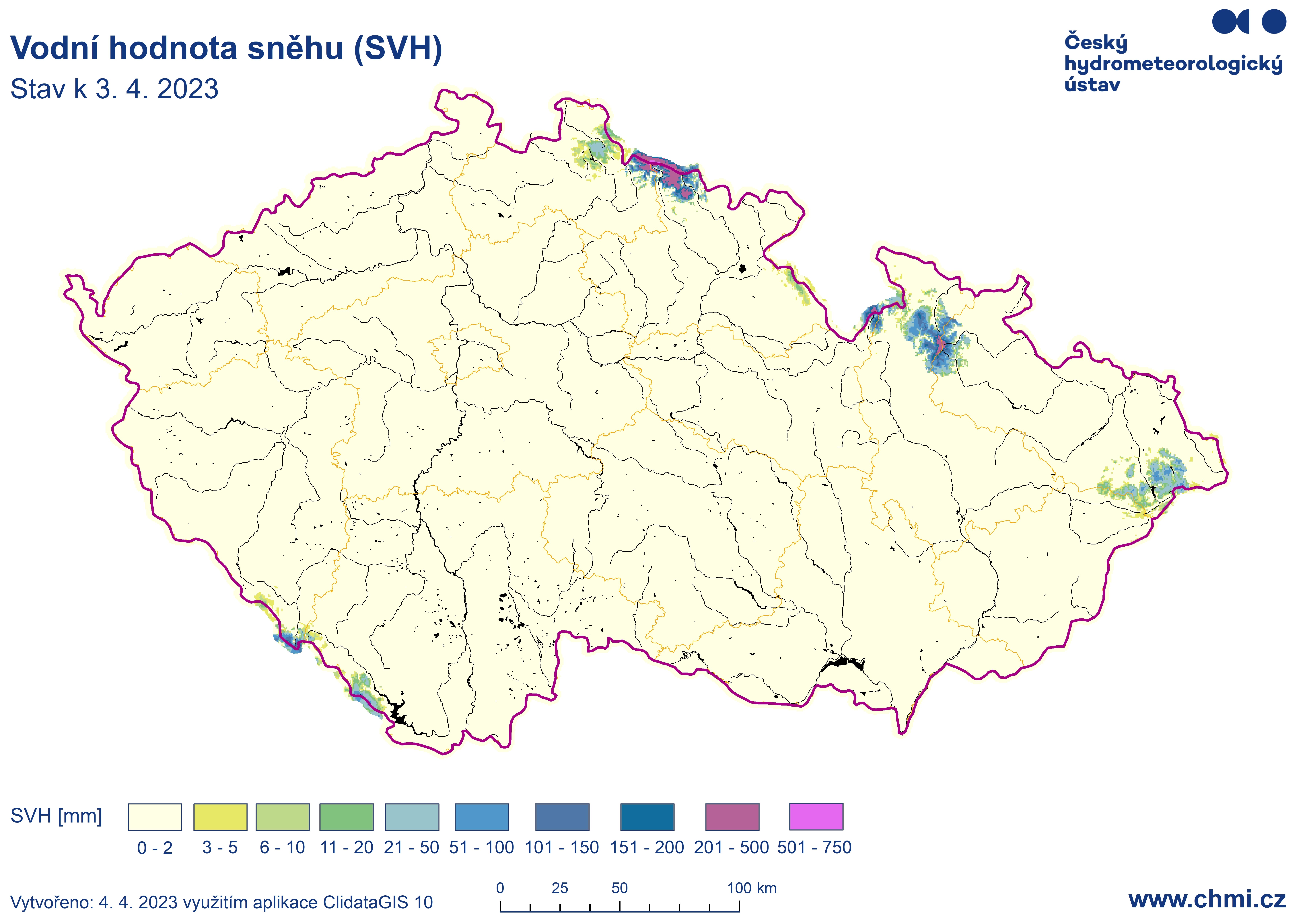 Mapa rozložení vodní hodnoty sněhu (SVH) v ČR ke dni 03.04.2023