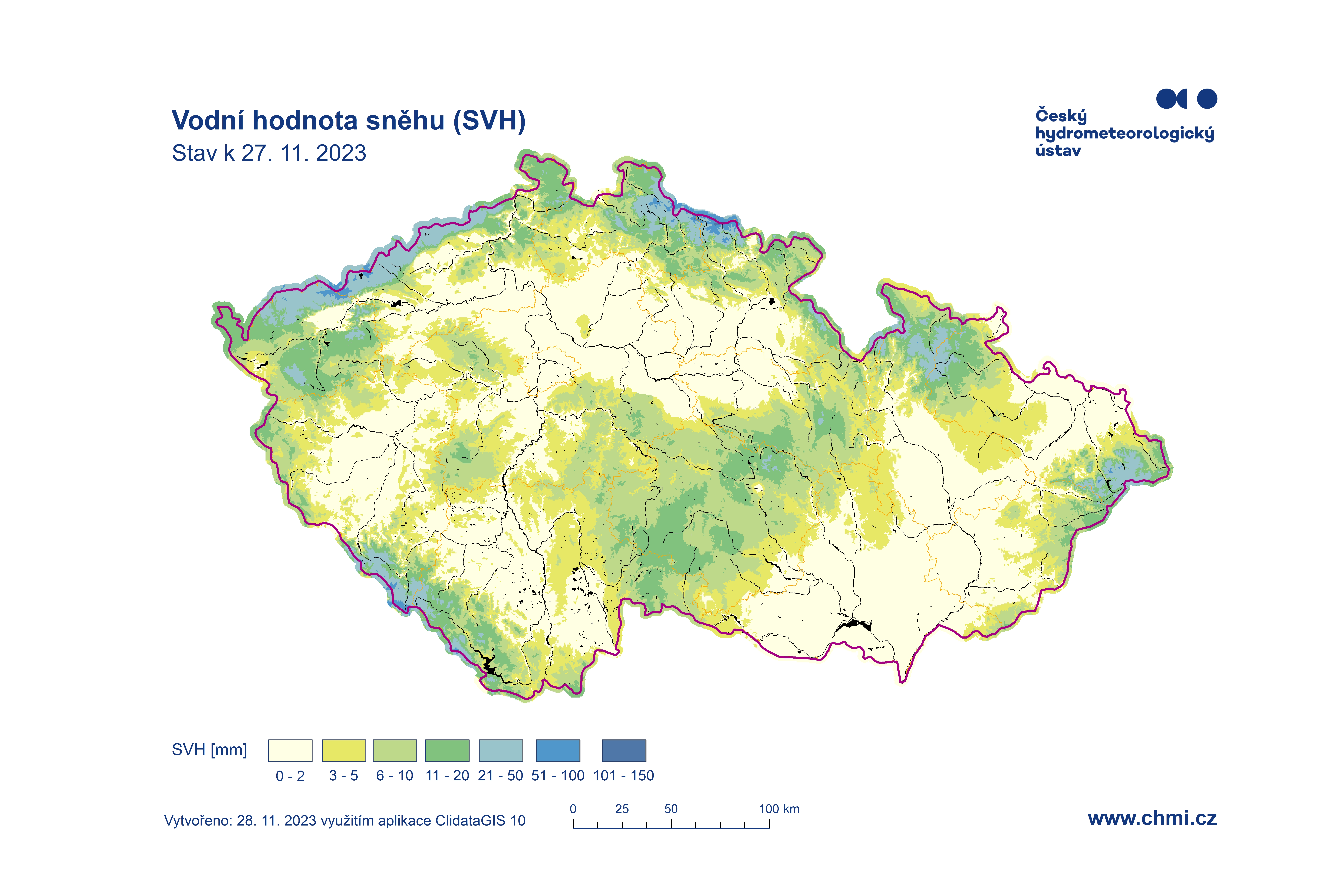 Odhad celkového množství vody ve sněhové pokrývce na území ČR k 27. 11. 2023 činí cca 0,426 mld. m3, což představuje v průměru cca 5,4 mm (5,4 litrů na jeden metr čtvereční).