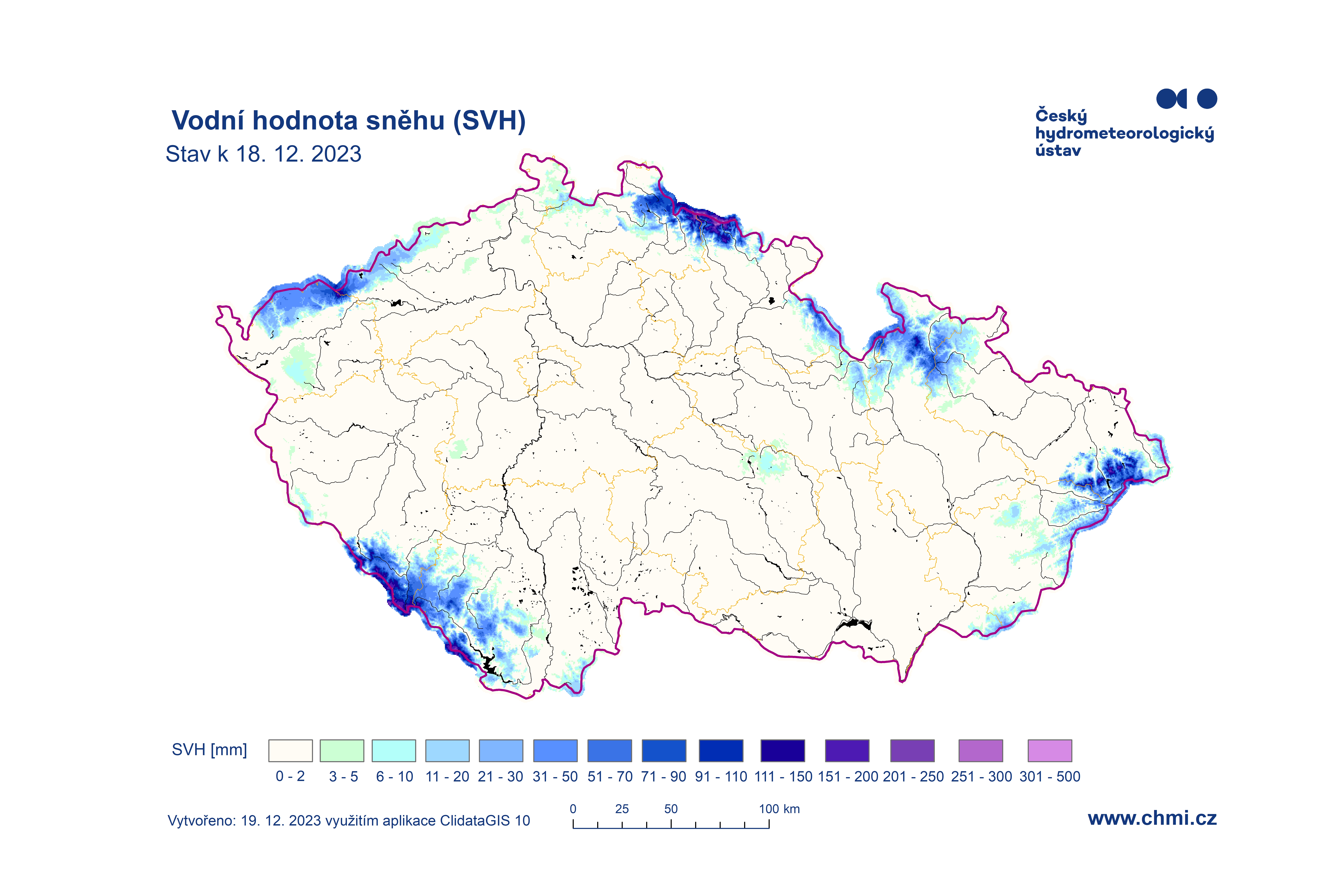 Odhad celkového množství vody ve sněhové pokrývce na území ČR k 18. 12. 2023 činí cca 0,268 mld. m3, což představuje v průměru cca 3,4 (3,4 litrů na jeden metr čtvereční).