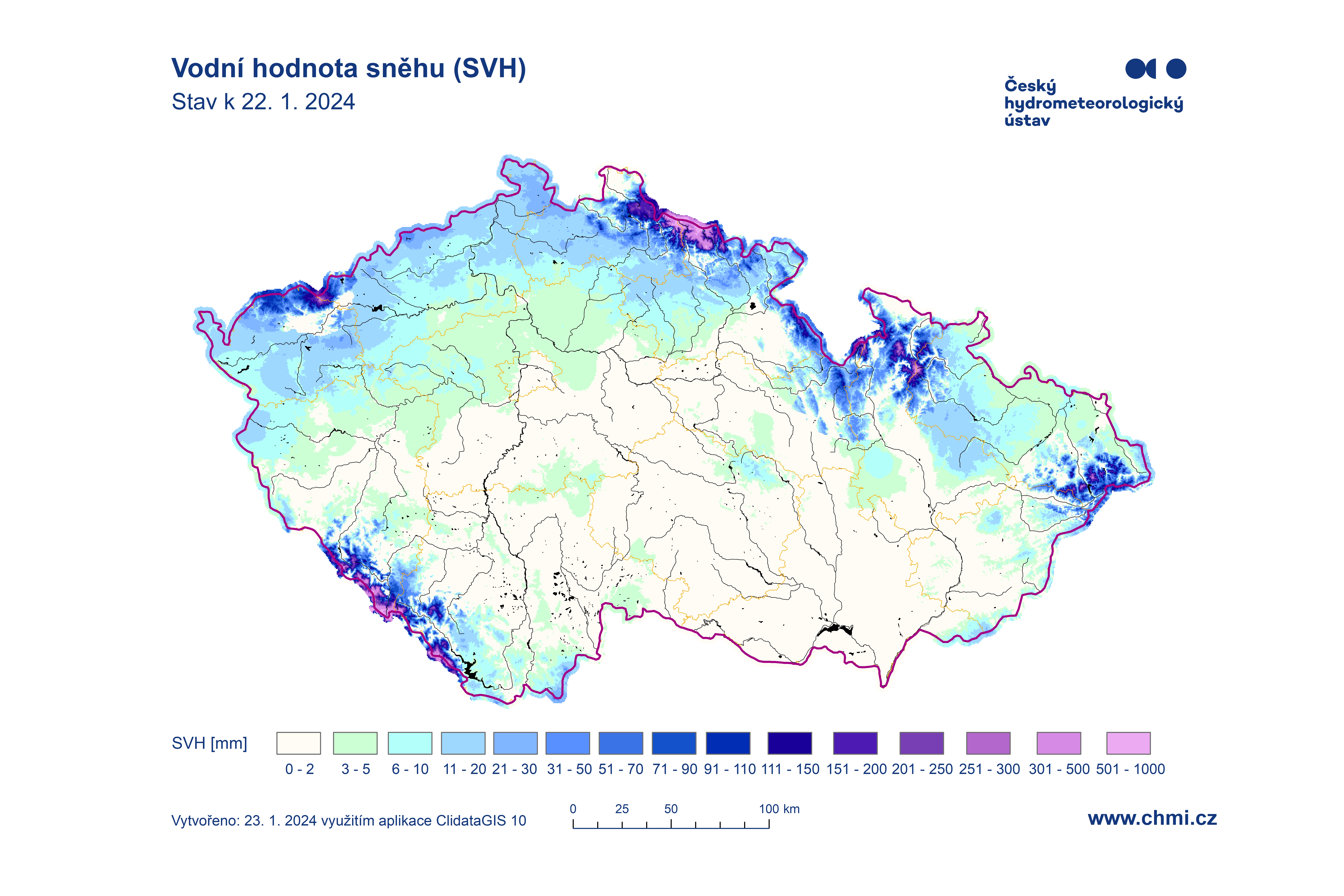 Odhad celkového množství vody ve sněhové pokrývce na území ČR k 22. 1. 2024 činí cca 0,781 mld. m3, což představuje v průměru cca 9,9 mm (9,9 litrů na jeden metr čtvereční).
