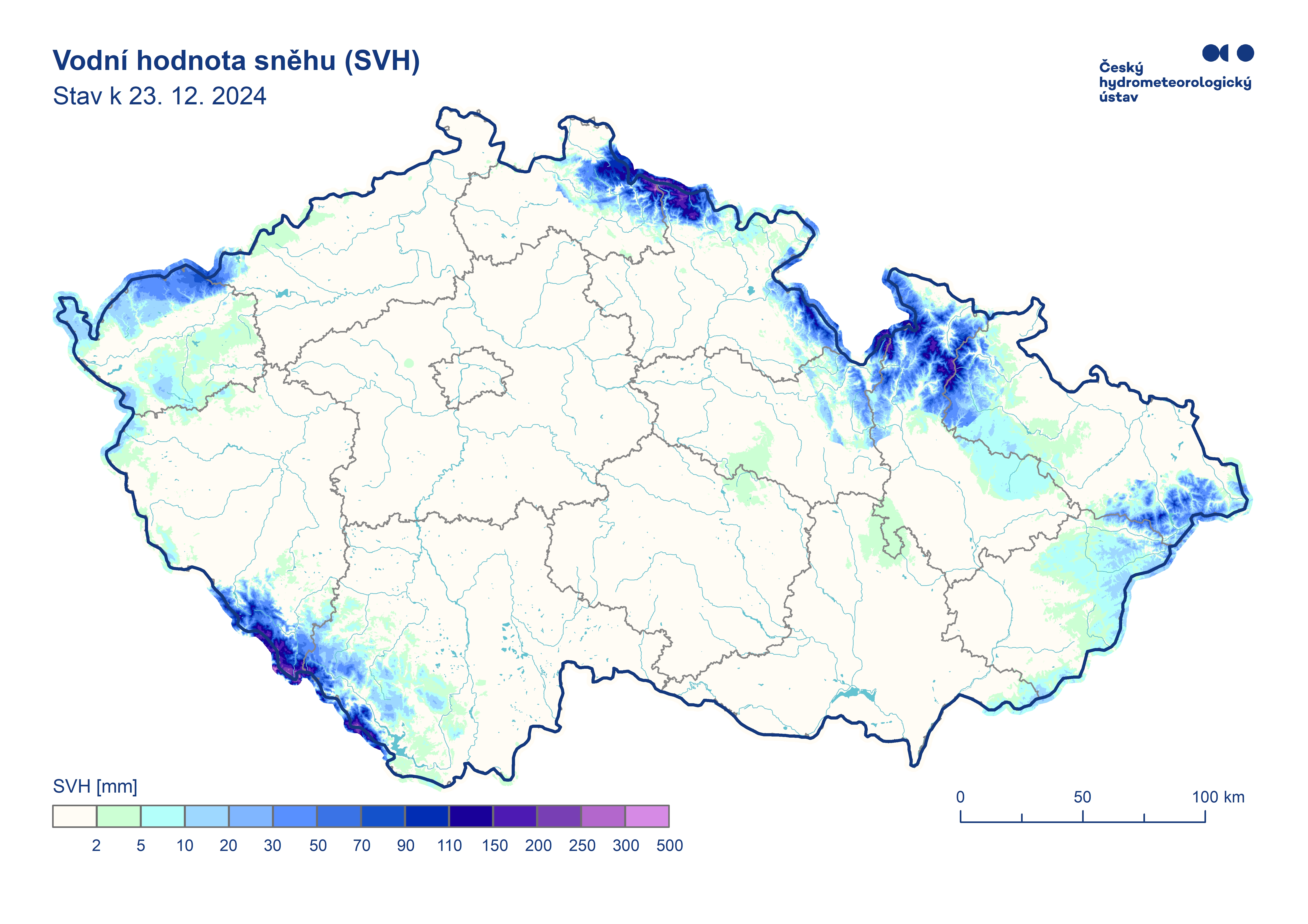 Odhad celkového množství vody ve sněhové pokrývce na území ČR k 23. 12. 2024 činí cca 0,316 mld. m3, což představuje v průměru cca 4 mm (4 litrů na jeden metr čtvereční).