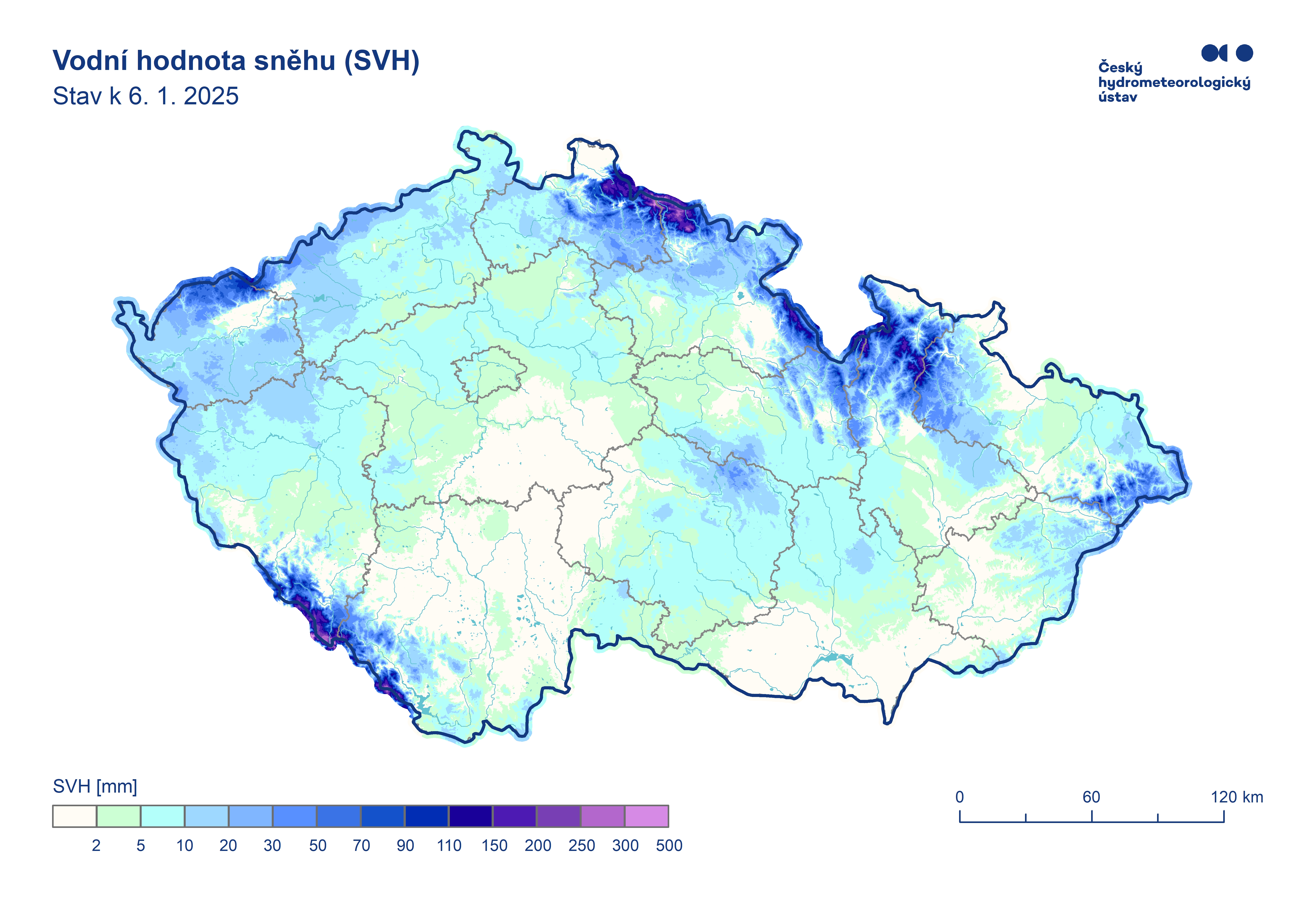 Mapa rozložení vodní hodnoty sněhu (SVH) v ČR ke dni 06.01.2025