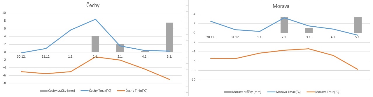 V úvodu týdne pokračoval inverzní ráz počasí. Na horách bylo slunečno a relativně teplo (okolo nuly, nebo nad nulou), v nížinách byly často mrznoucí mlhy, nebo nízká oblačnost a většinou i celodenní mráz. Ve středu byla v Čechách inverze rozrušena, ale na Moravě ještě místy pokračovala. V průběhu čtvrtečního dne přešla od severozápadu studená fronta, za kterou se na horách ochladilo pod nulu, a srážky postupně přešly ve všech polohách ve sněhové. Zejména na Moravě už místy nasněžilo i v nižších a středních polohách.