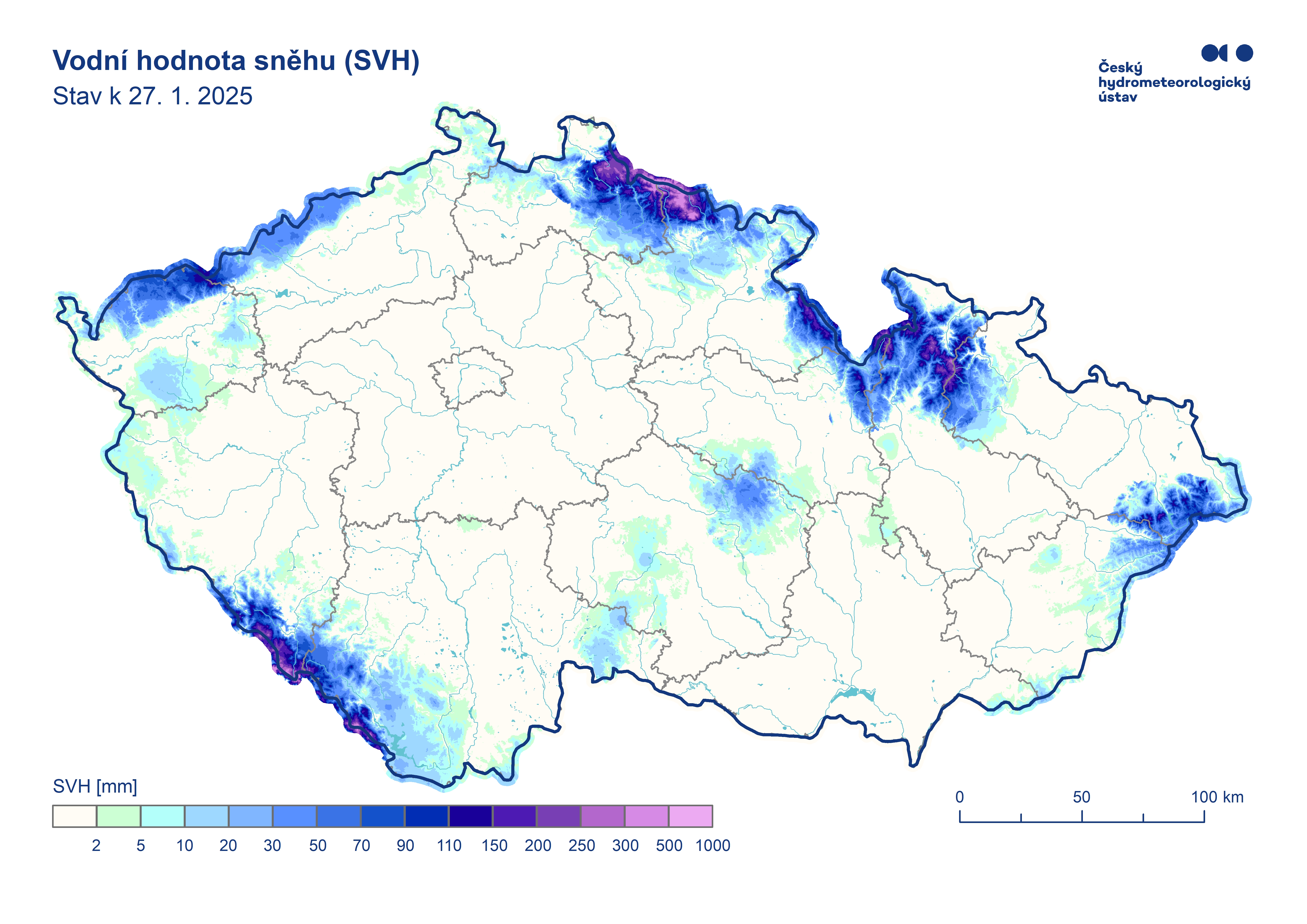 Odhad celkového množství vody ve sněhové pokrývce na území ČR k 27. 1. 2024 činí cca 0,583 mld. m3, což představuje v průměru cca 7,4 mm (7,4 litrů na jeden metr čtvereční).
