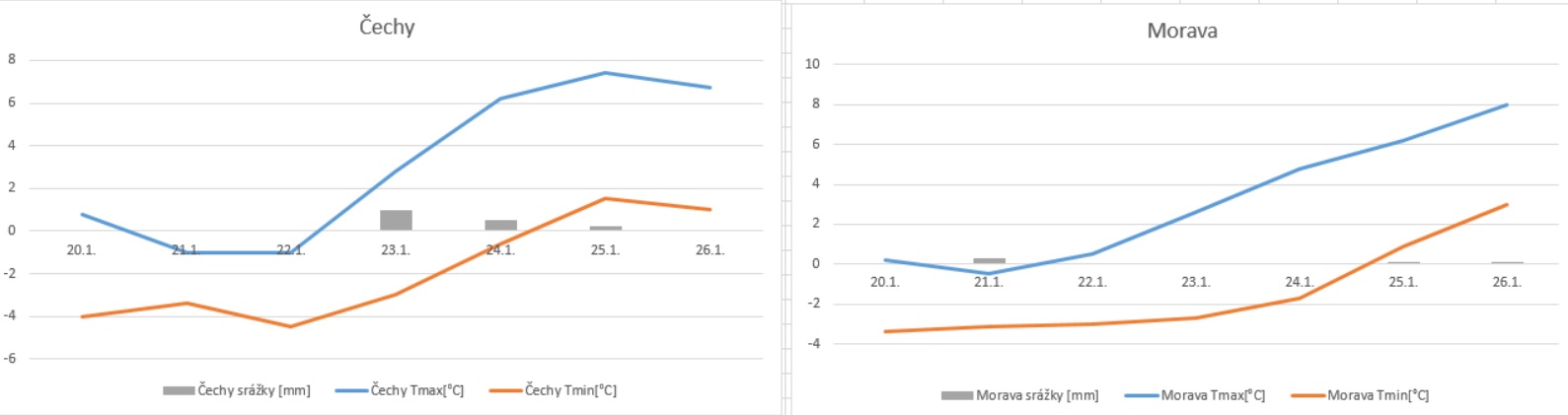 Až do čtvrtka pokračovalo převážně inverzní počasí a jen někde se vyskytlo mrholení, nebo slabé sněžení. Ve čtvrtek přešla od západu studená fronta, za kterou se hlavně na hřebenech hor přechodně ochladilo a na horách napadlo většinou několik centimetrů sněhu. V nížinách se naopak za frontou převážně oteplilo. Ještě více se začalo oteplovat v průběhu víkendu, kdy i na horách přešly srážky v dešťové a teploty byly i tam většinou nad nulou.