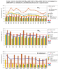 Trend imisních charakteristik pro PM10 je hodnocen v aglomeracích na základě dat ze stanic, pro které existuje ucelená časová řada od roku 2001 (obr. V.2). Po strmém poklesu PM10 do roku 1999 koncentrace opět stoupaly a v roce 2003 dosahovaly svých maxim v důsledku nepříznivých rozptylových podmínek v únoru a prosinci a podnormálního množství srážek. Od roku 2003 imise v celkovém trendu klesají, ačkoliv mezi jednotlivými roky se objevuje kolísání, zejména v důsledku meteorologických a rozptylových podmínek. Vyšší koncentrace PM10 tak byly naměřeny např. v letech 2006, 2010 a 2011. V letech 2012–2014 nevykazovala 36. nejvyšší denní koncentrace PM10 výrazný trend. V roce 2015 je patrný strmý pokles následovaný stagnací v roce 2016 a v roce 2017 byl naopak zaznamenán mírný vzestup 36. nejvyšší denní koncentrace i ročního průměru PM10.